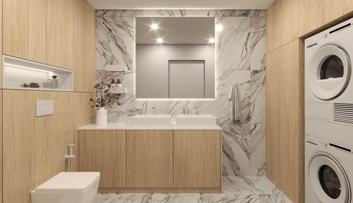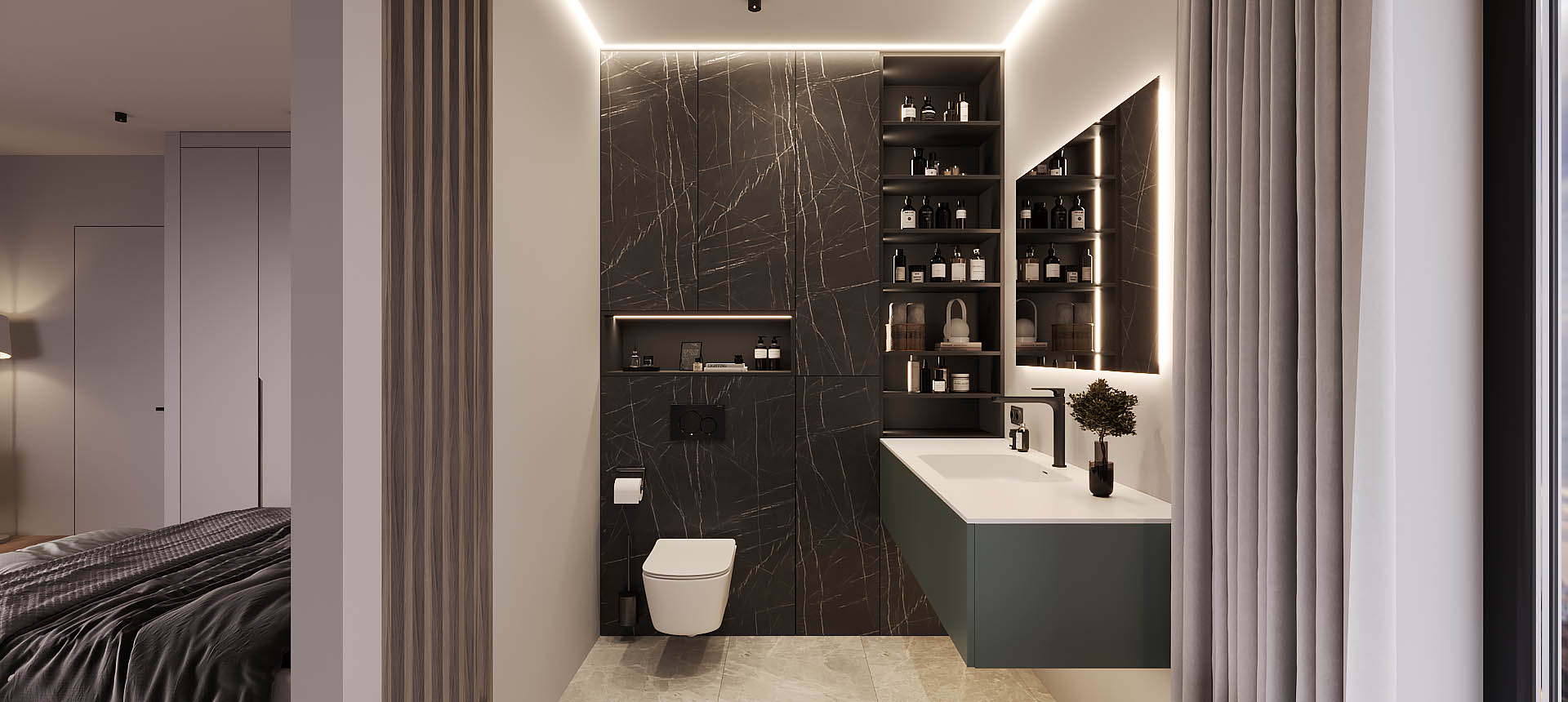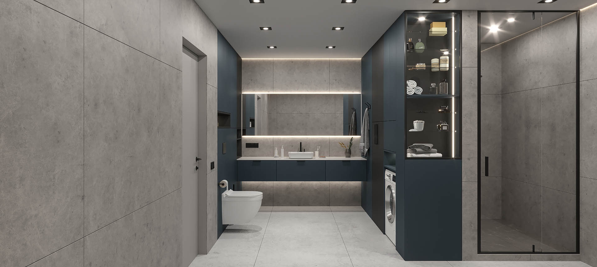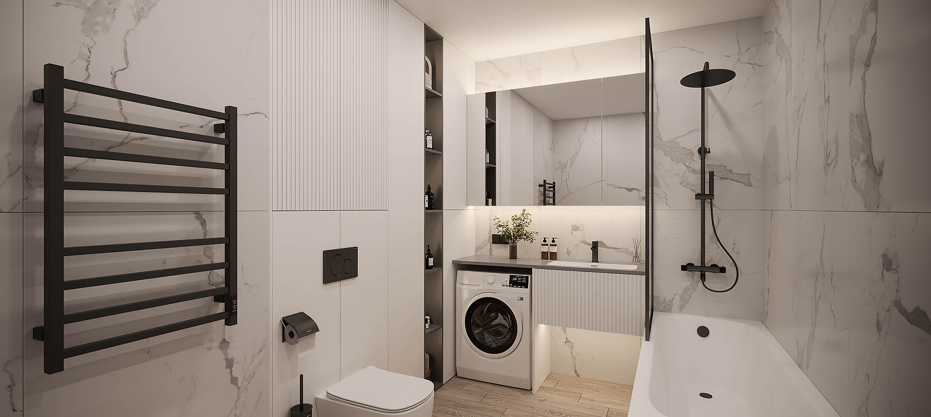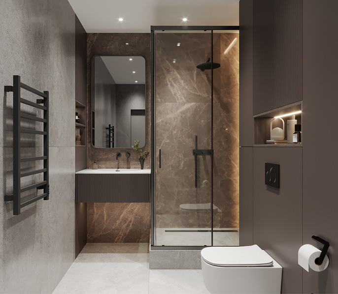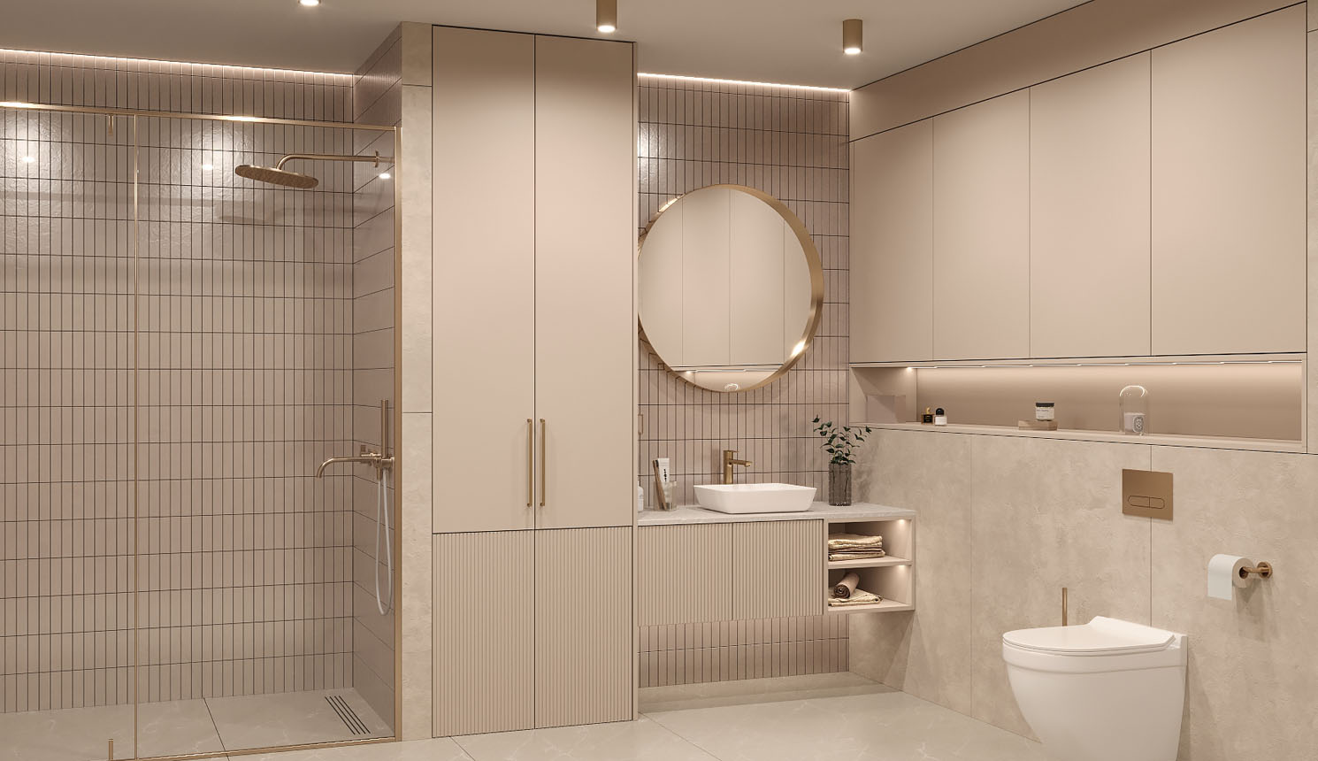«У меня все проекты с компанией («Стильные Кухни и Интерьеры) были хорошие, но мебелью в ванную комнату я довольна больше всего на свете. Мне сделали тумбу под раковину, две навесные колонки по бокам, зеркало с подсветкой, а также встроенный шкаф напротив. Из-за высоты потолков и размеров шкафов было непросто спроектировать все так, как надо: были опасения, что дверцы ослабнут, что тяжелые дверцы нельзя будет открывать одним легким нажатием. Но в итоге в фасады добавили направляющие, которые их усиливают. И еще удалось сделать эти высокие двери с механизмом push-to-open. У меня не очень большая площадь ванной, поэтому хотелось обойтись без лишних деталей, в том числе и выступающих ручек, которые я бы постоянно задевала»,
