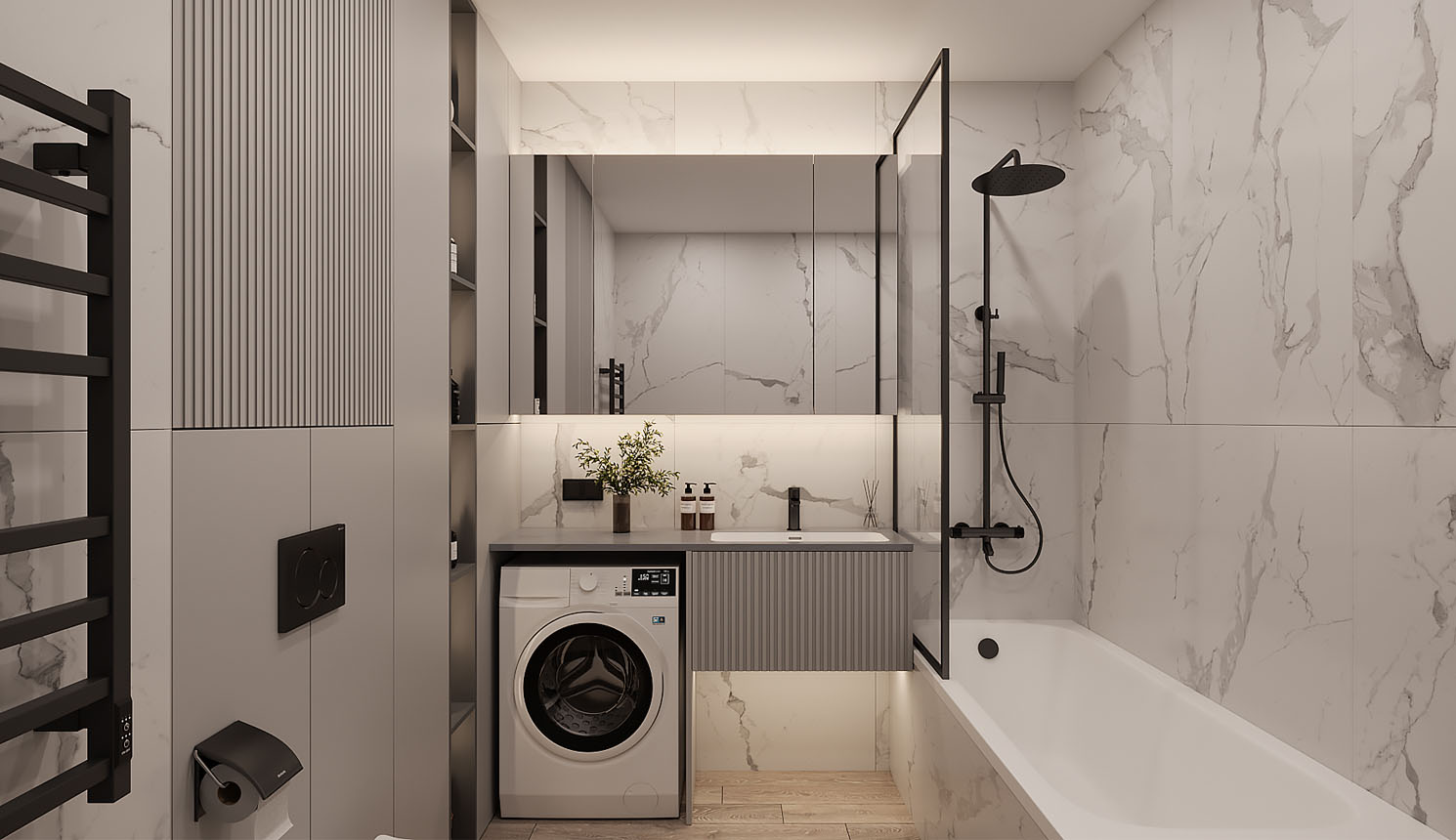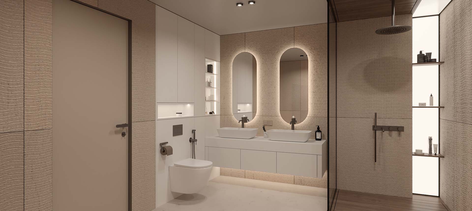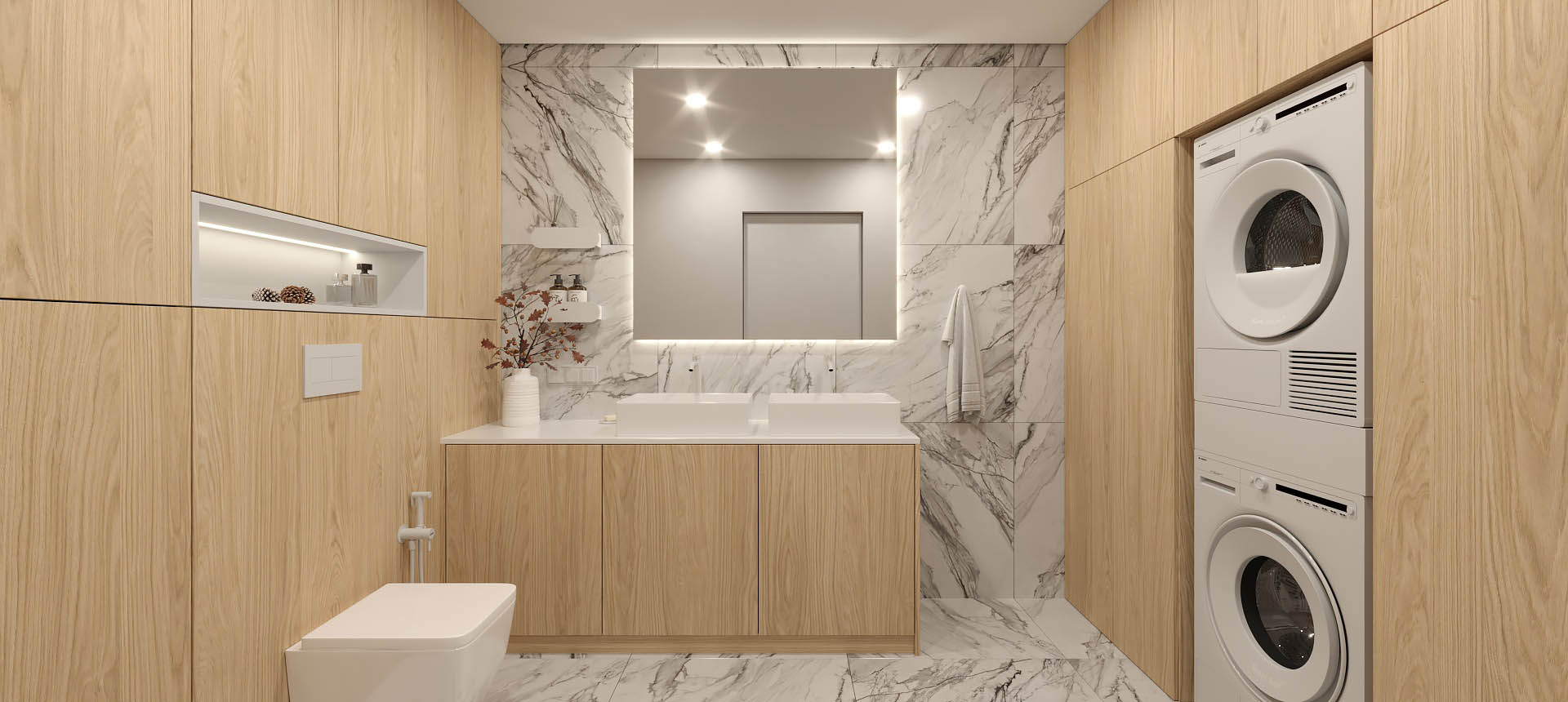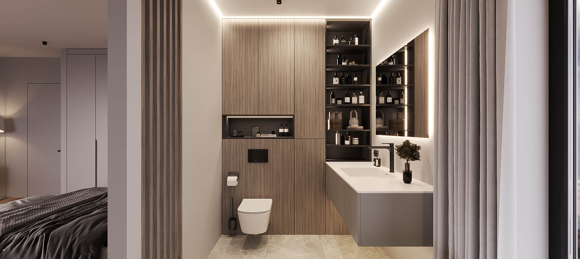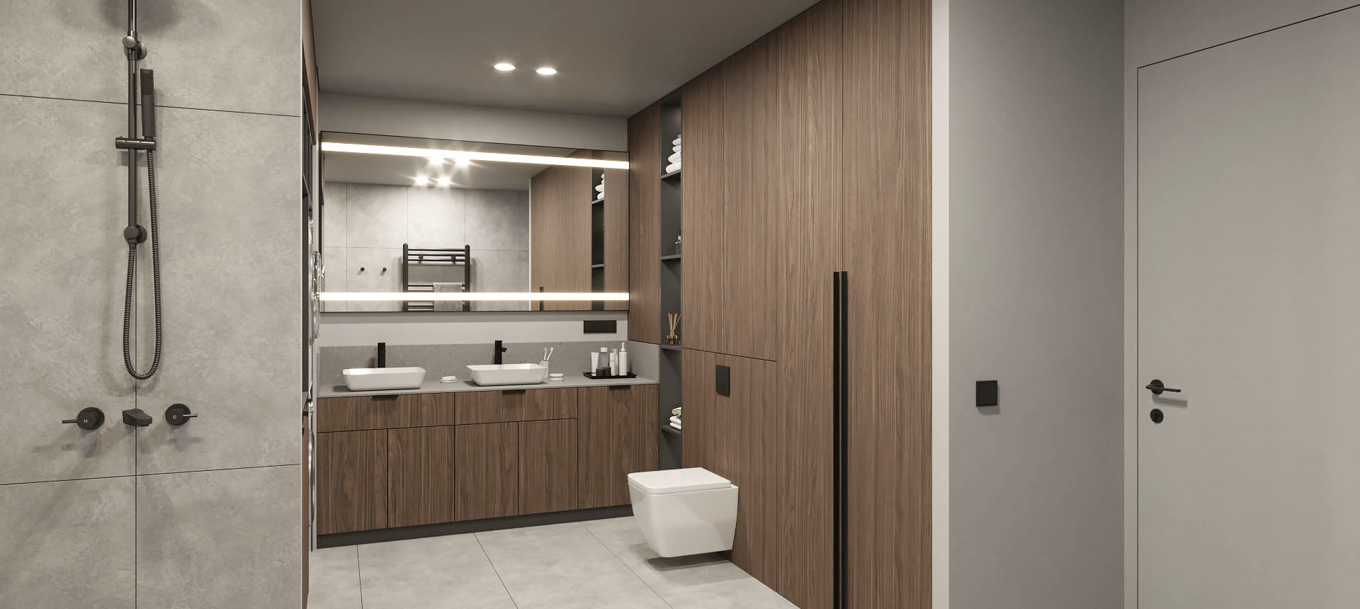 «У меня все проекты с компанией («Стильные Кухни и Интерьеры) были хорошие, но мебелью в ванную комнату я довольна больше всего на свете. Мне сделали тумбу под раковину, две навесные колонки по бокам, зеркало с подсветкой, а также встроенный шкаф напротив. Из-за высоты потолков и размеров шкафов было непросто спроектировать все так, как надо: были опасения, что дверцы ослабнут, что тяжелые дверцы нельзя будет открывать одним легким нажатием. Но в итоге в фасады добавили направляющие, которые их усиливают. И еще удалось сделать эти высокие двери с механизмом push-to-open. У меня не очень большая площадь ванной, поэтому хотелось обойтись без лишних деталей, в том числе и выступающих ручек, которые я бы постоянно задевала»,