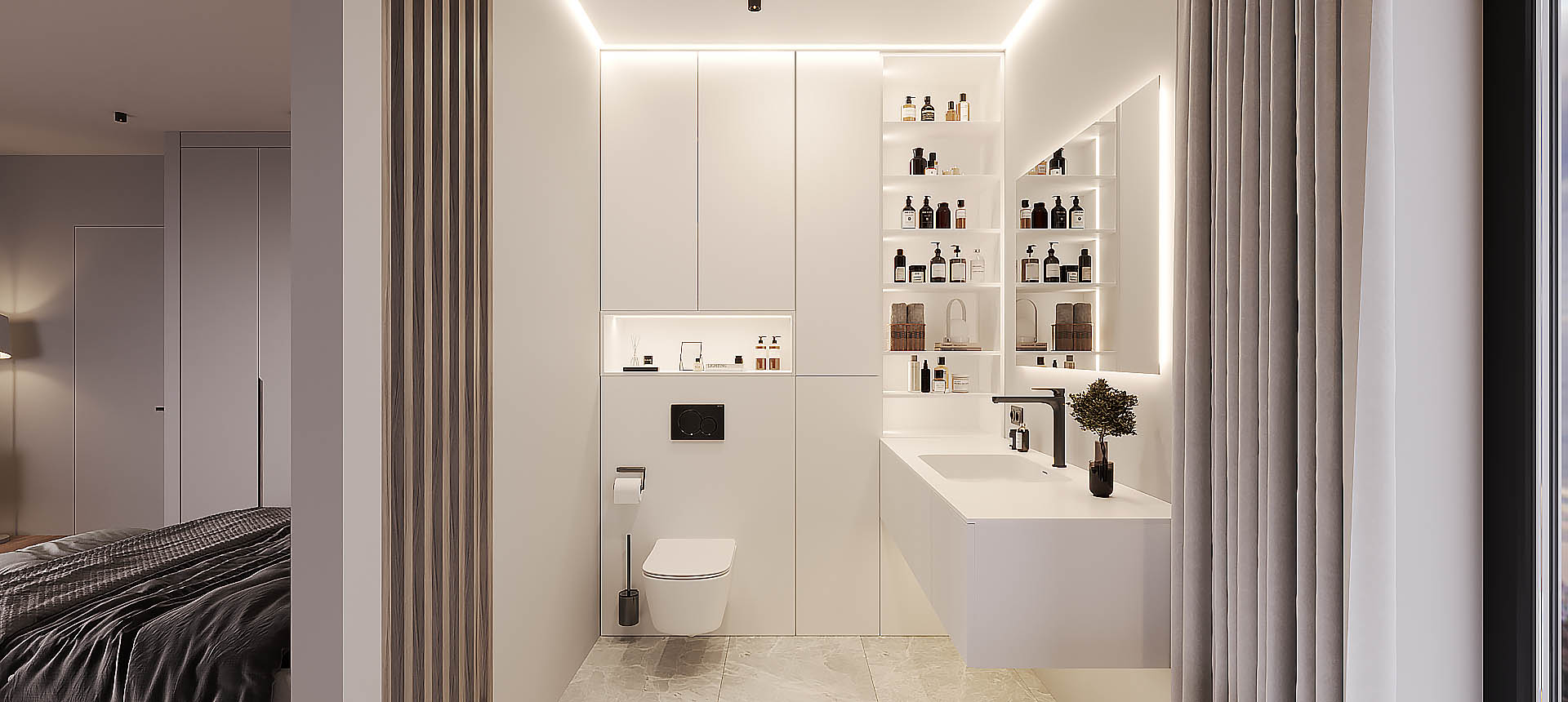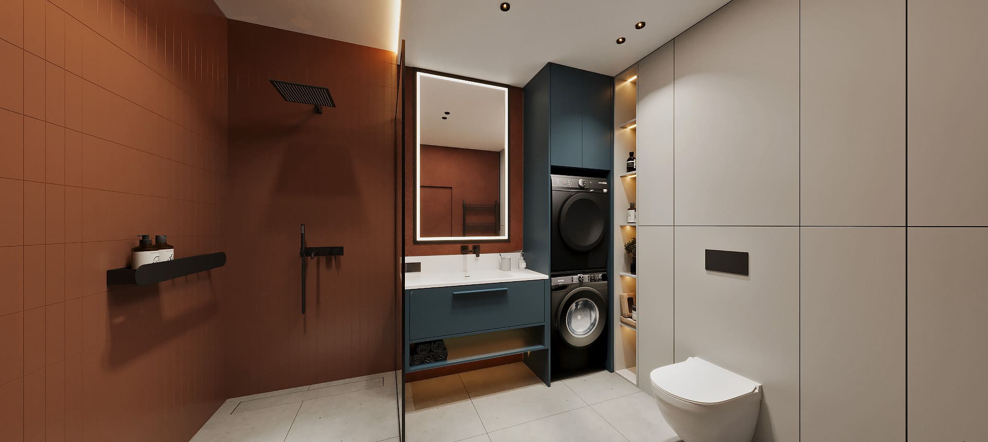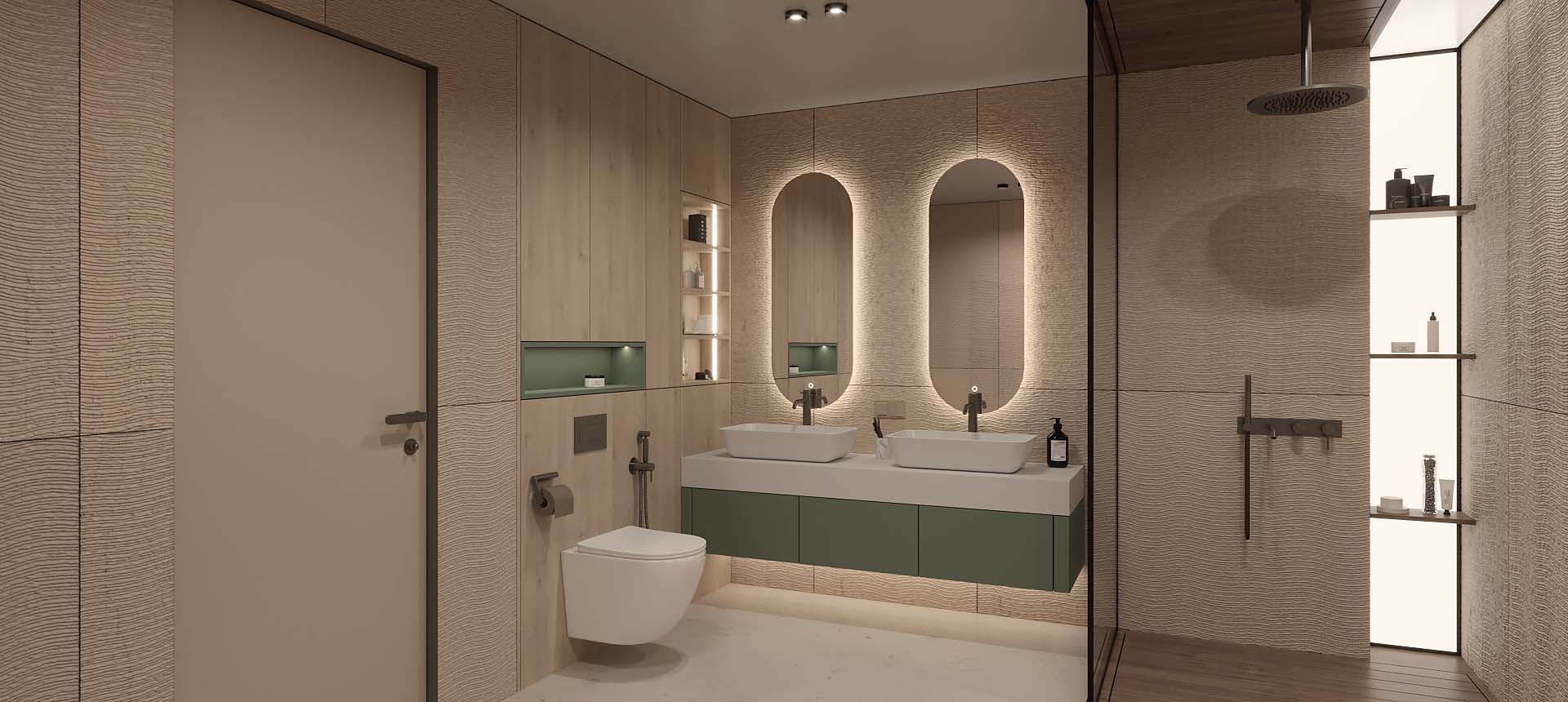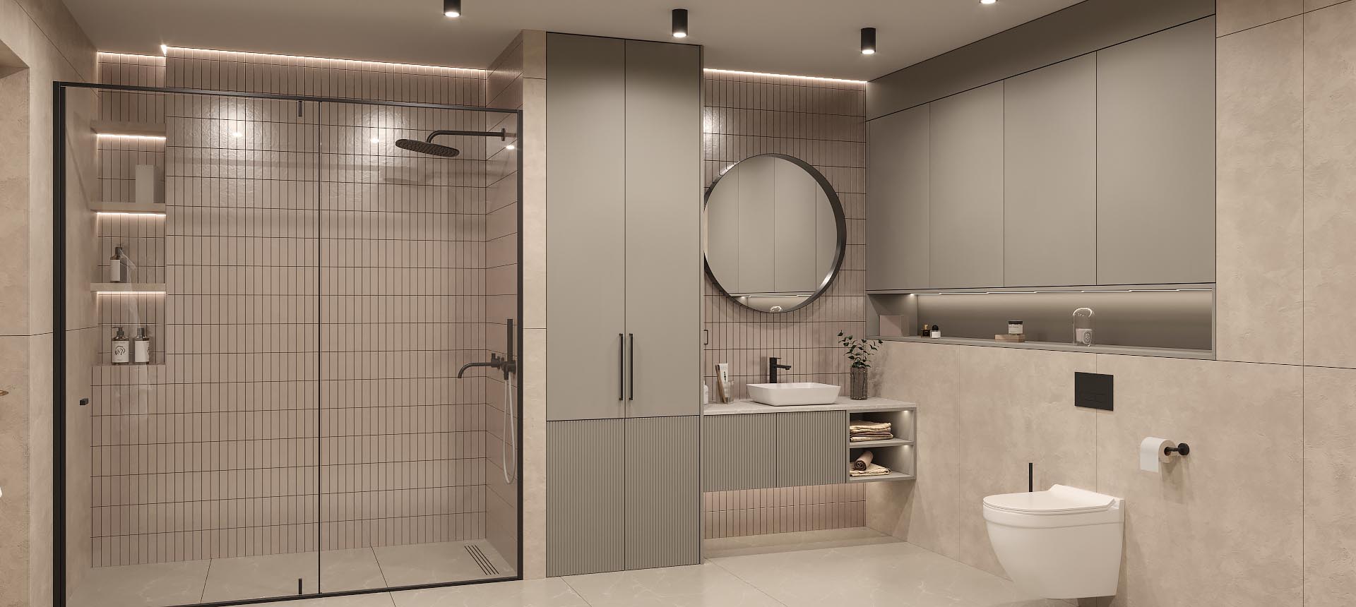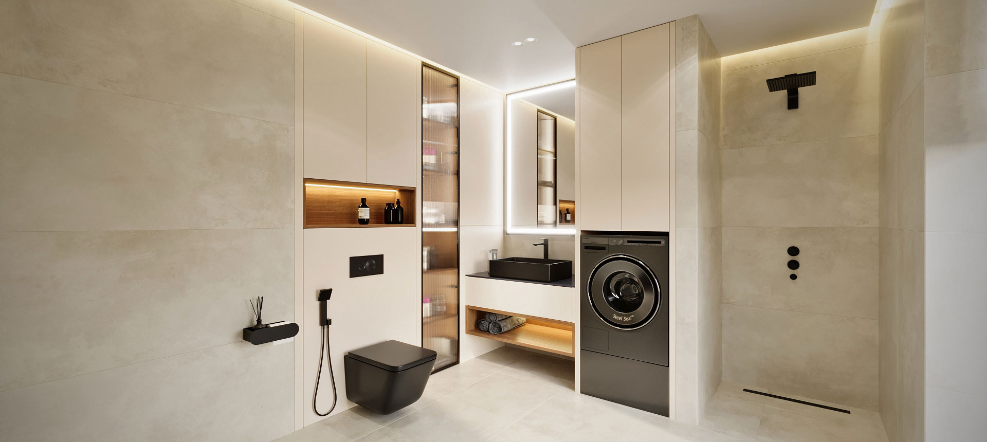«У меня все проекты с компанией («Стильные Кухни и Интерьеры) были хорошие, но мебелью в ванную комнату я довольна больше всего на свете. Мне сделали тумбу под раковину, две навесные колонки по бокам, зеркало с подсветкой, а также встроенный шкаф напротив. Из-за высоты потолков и размеров шкафов было непросто спроектировать все так, как надо: были опасения, что дверцы ослабнут, что тяжелые дверцы нельзя будет открывать одним легким нажатием. Но в итоге в фасады добавили направляющие, которые их усиливают. И еще удалось сделать эти высокие двери с механизмом push-to-open. У меня не очень большая площадь ванной, поэтому хотелось обойтись без лишних деталей, в том числе и выступающих ручек, которые я бы постоянно задевала»,