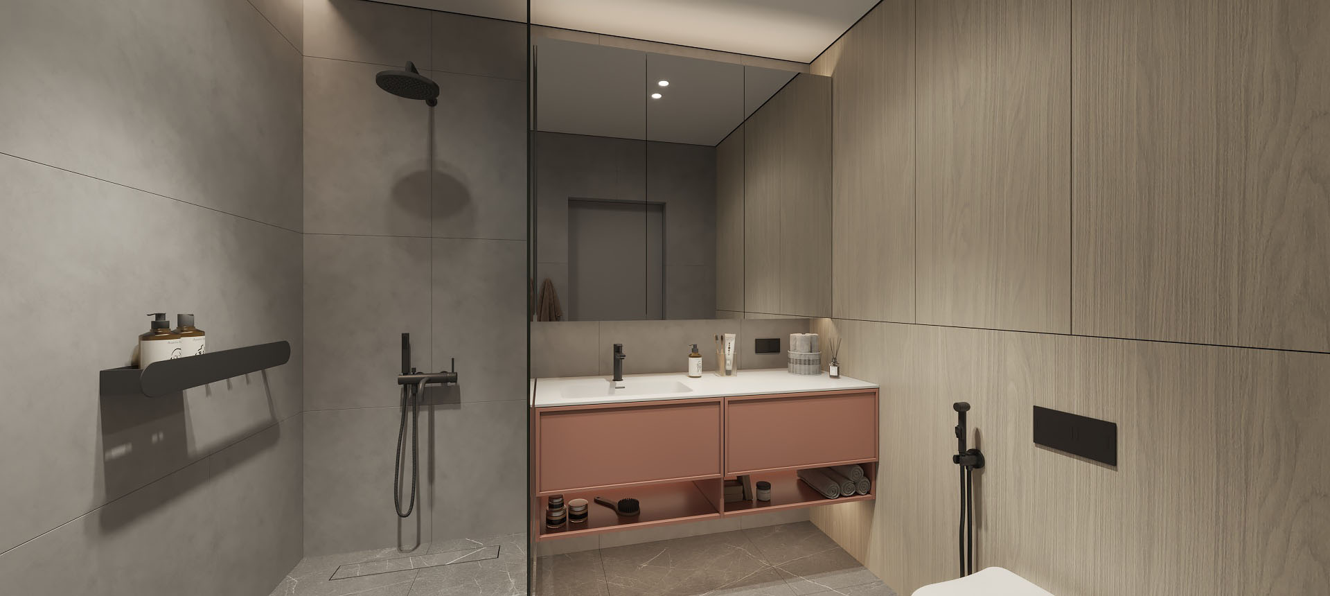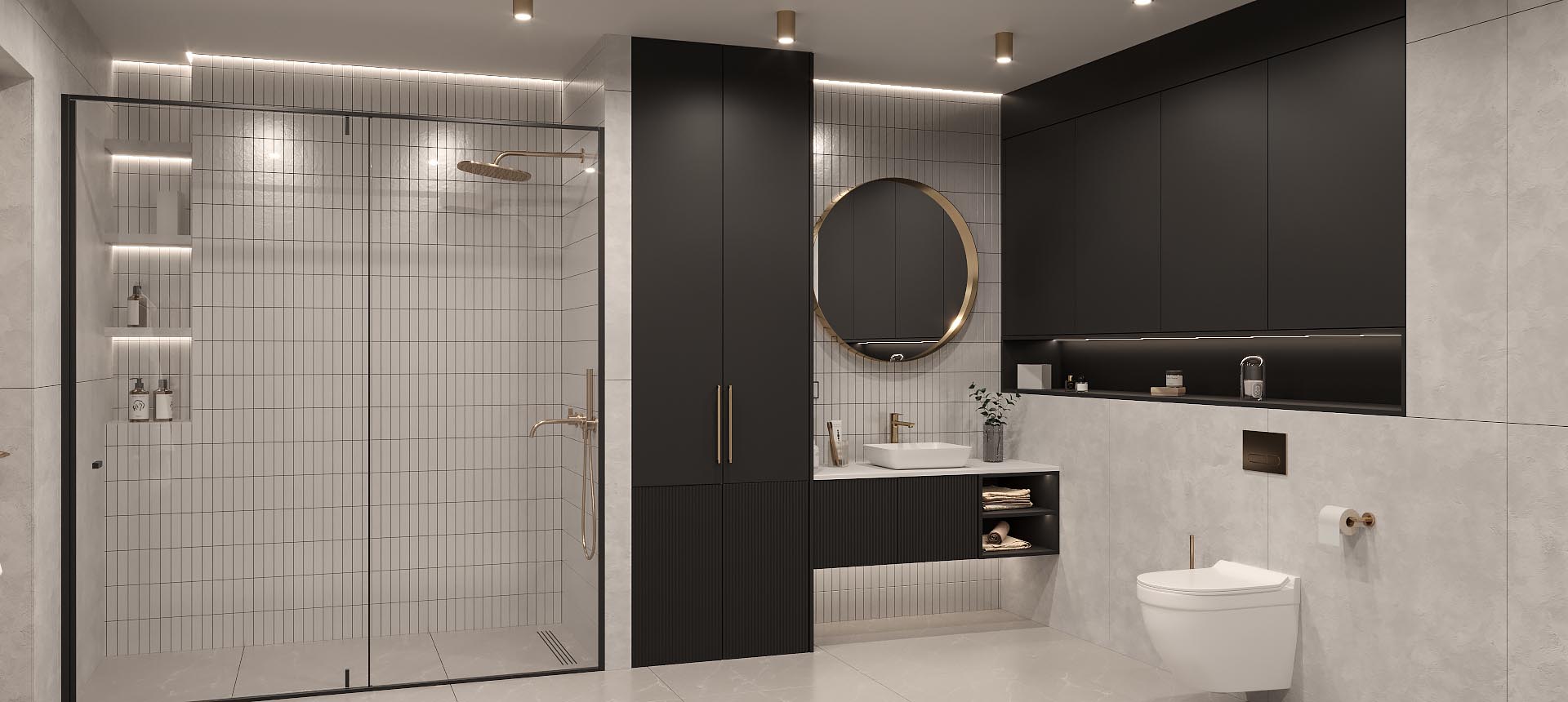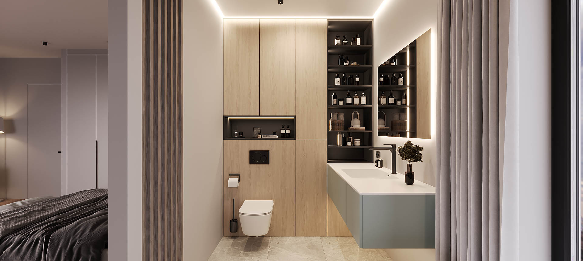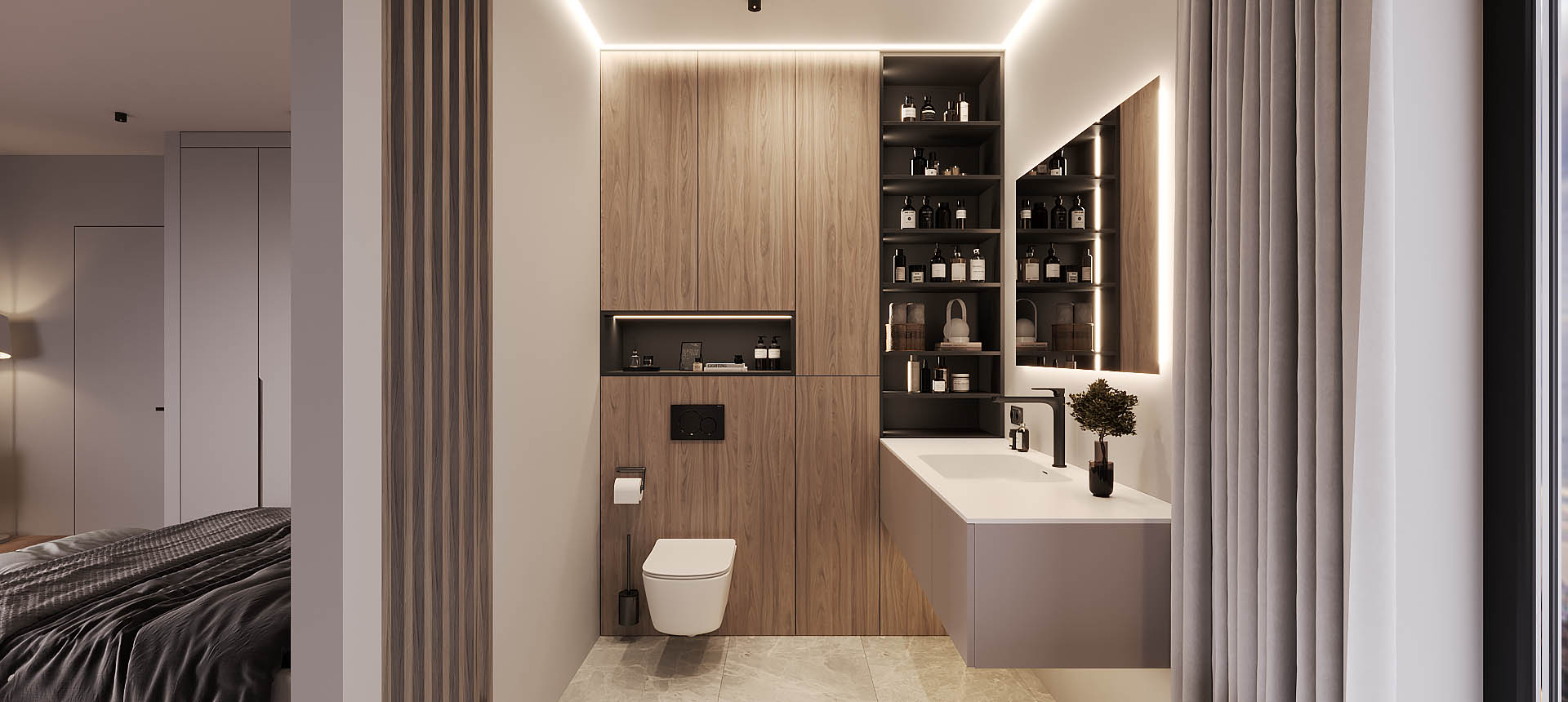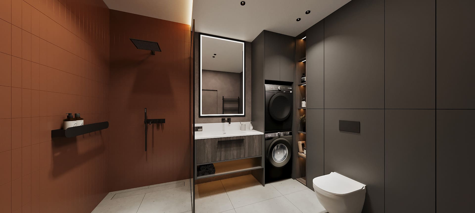 «У меня все проекты с компанией («Стильные Кухни и Интерьеры) были хорошие, но мебелью в ванную комнату я довольна больше всего на свете. Мне сделали тумбу под раковину, две навесные колонки по бокам, зеркало с подсветкой, а также встроенный шкаф напротив. Из-за высоты потолков и размеров шкафов было непросто спроектировать все так, как надо: были опасения, что дверцы ослабнут, что тяжелые дверцы нельзя будет открывать одним легким нажатием. Но в итоге в фасады добавили направляющие, которые их усиливают. И еще удалось сделать эти высокие двери с механизмом push-to-open. У меня не очень большая площадь ванной, поэтому хотелось обойтись без лишних деталей, в том числе и выступающих ручек, которые я бы постоянно задевала»,
