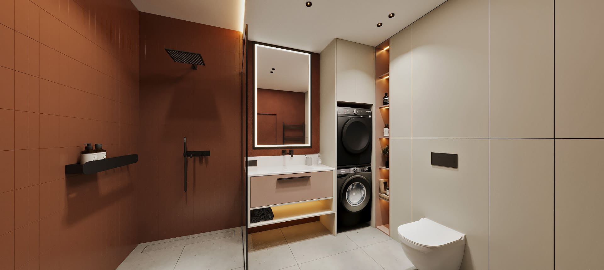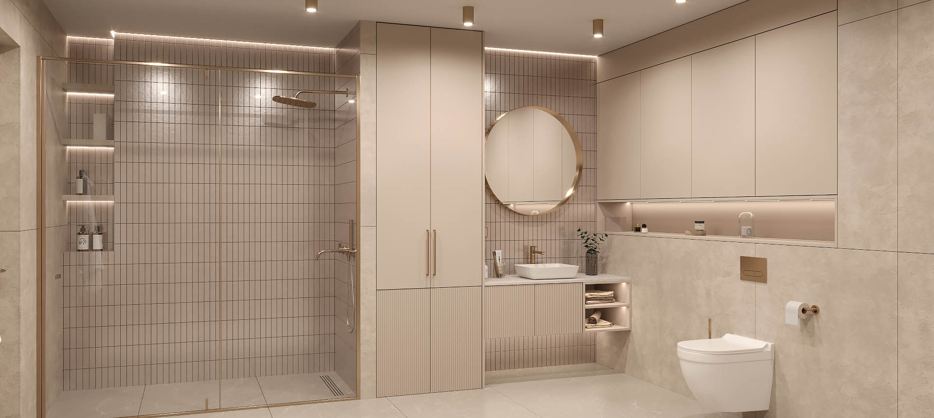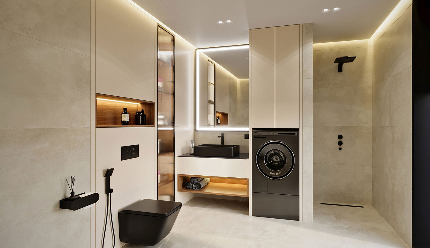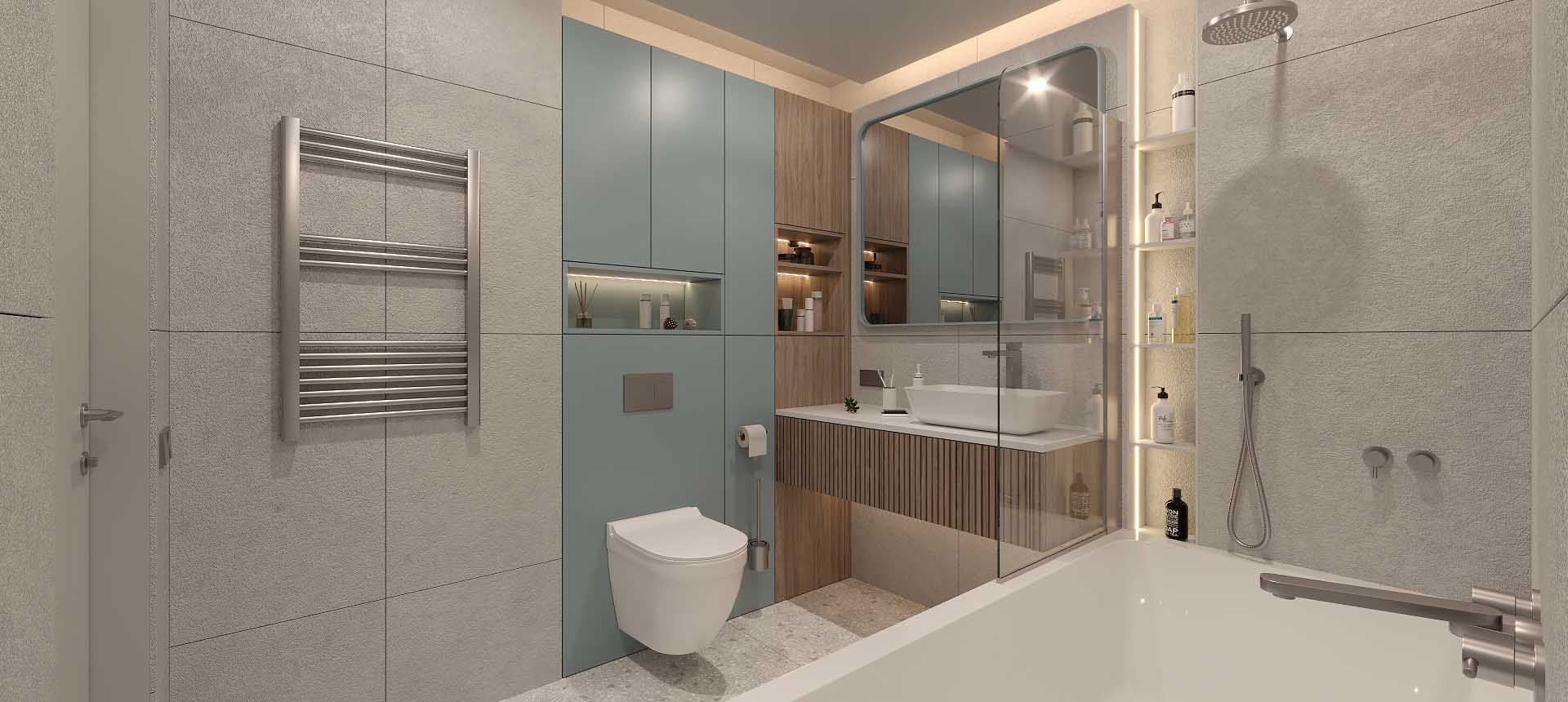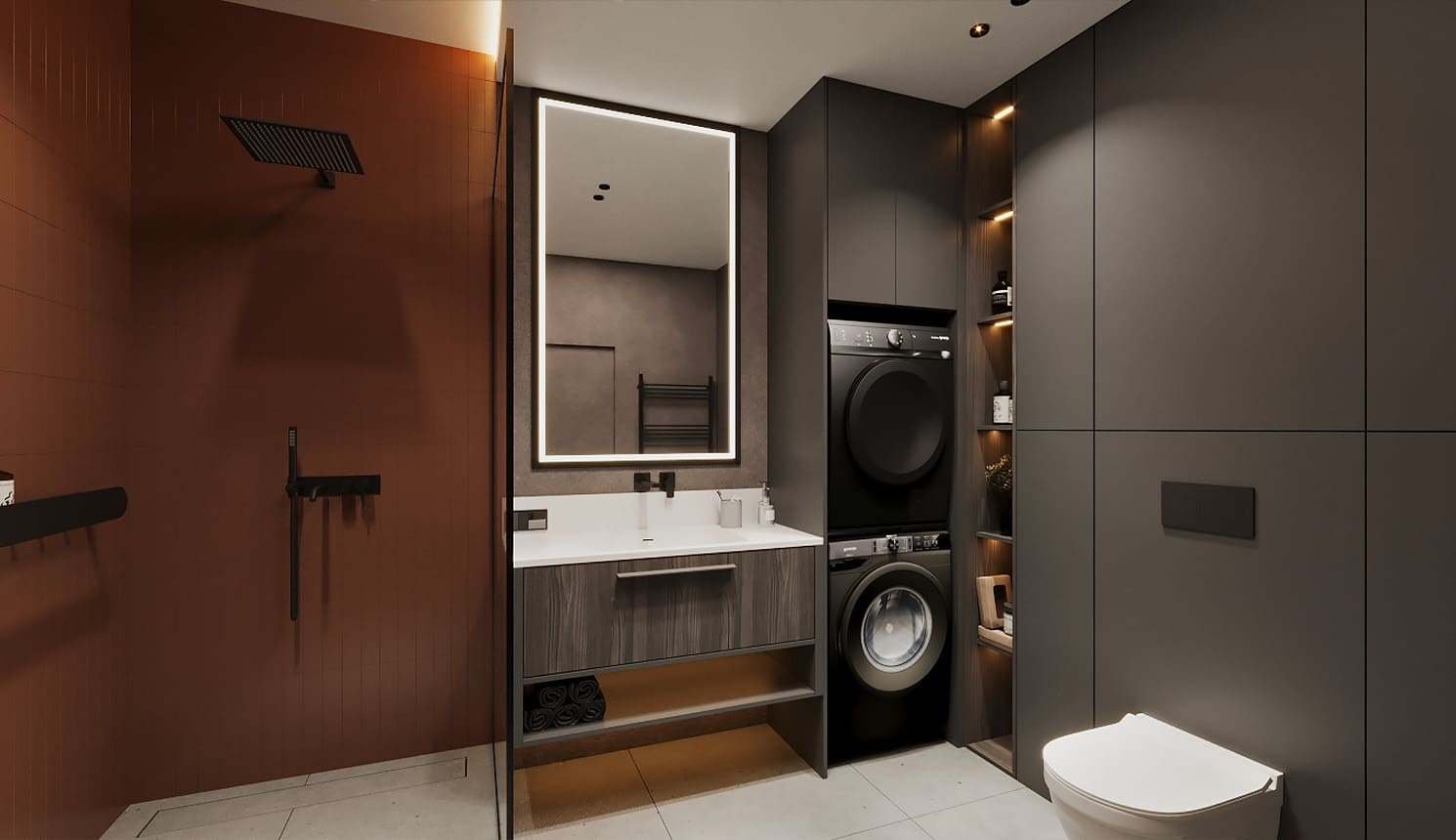 «У меня все проекты с компанией («Стильные Кухни и Интерьеры) были хорошие, но мебелью в ванную комнату я довольна больше всего на свете. Мне сделали тумбу под раковину, две навесные колонки по бокам, зеркало с подсветкой, а также встроенный шкаф напротив. Из-за высоты потолков и размеров шкафов было непросто спроектировать все так, как надо: были опасения, что дверцы ослабнут, что тяжелые дверцы нельзя будет открывать одним легким нажатием. Но в итоге в фасады добавили направляющие, которые их усиливают. И еще удалось сделать эти высокие двери с механизмом push-to-open. У меня не очень большая площадь ванной, поэтому хотелось обойтись без лишних деталей, в том числе и выступающих ручек, которые я бы постоянно задевала»,