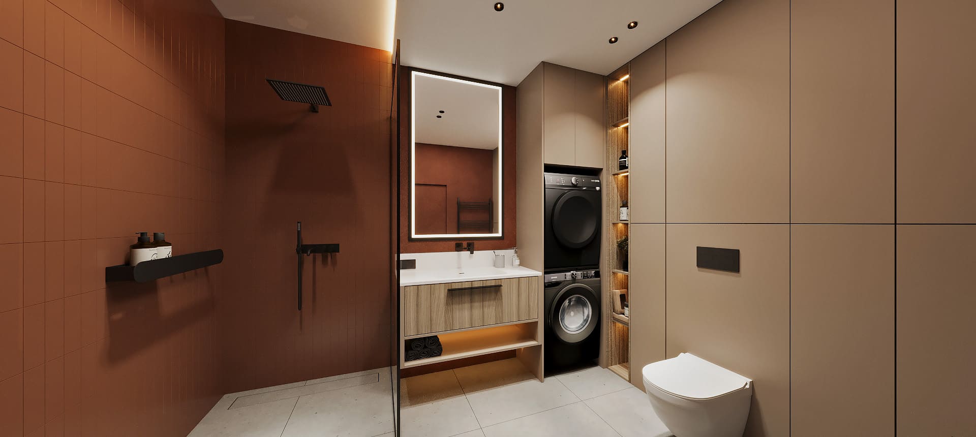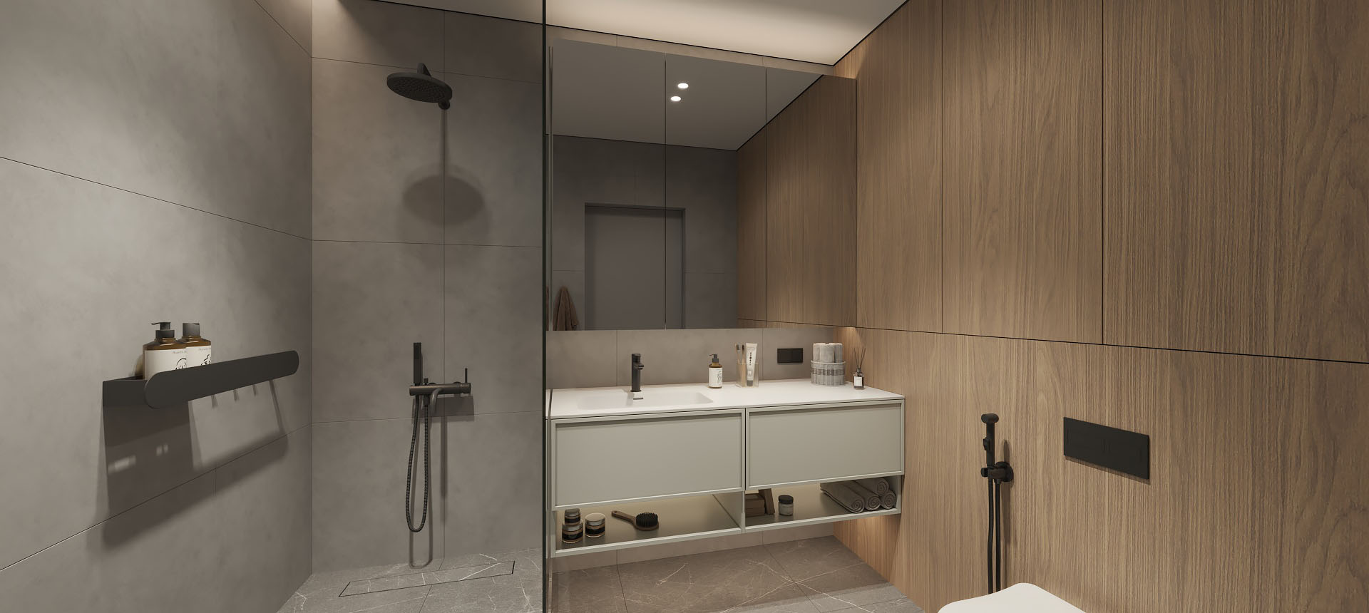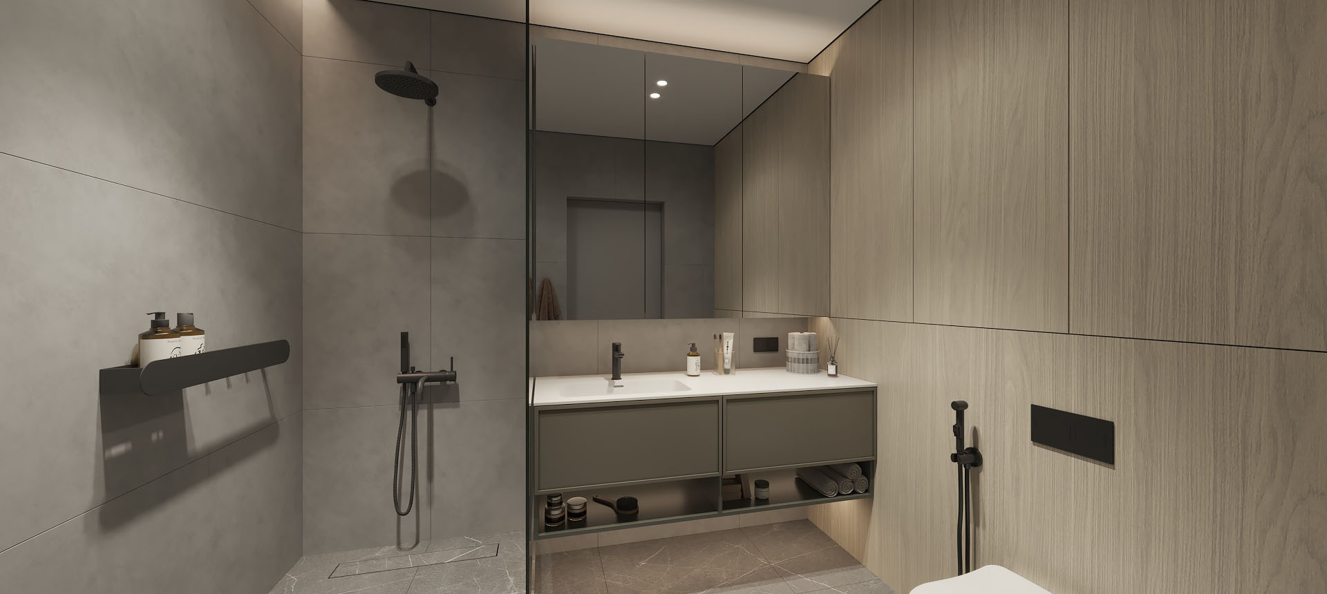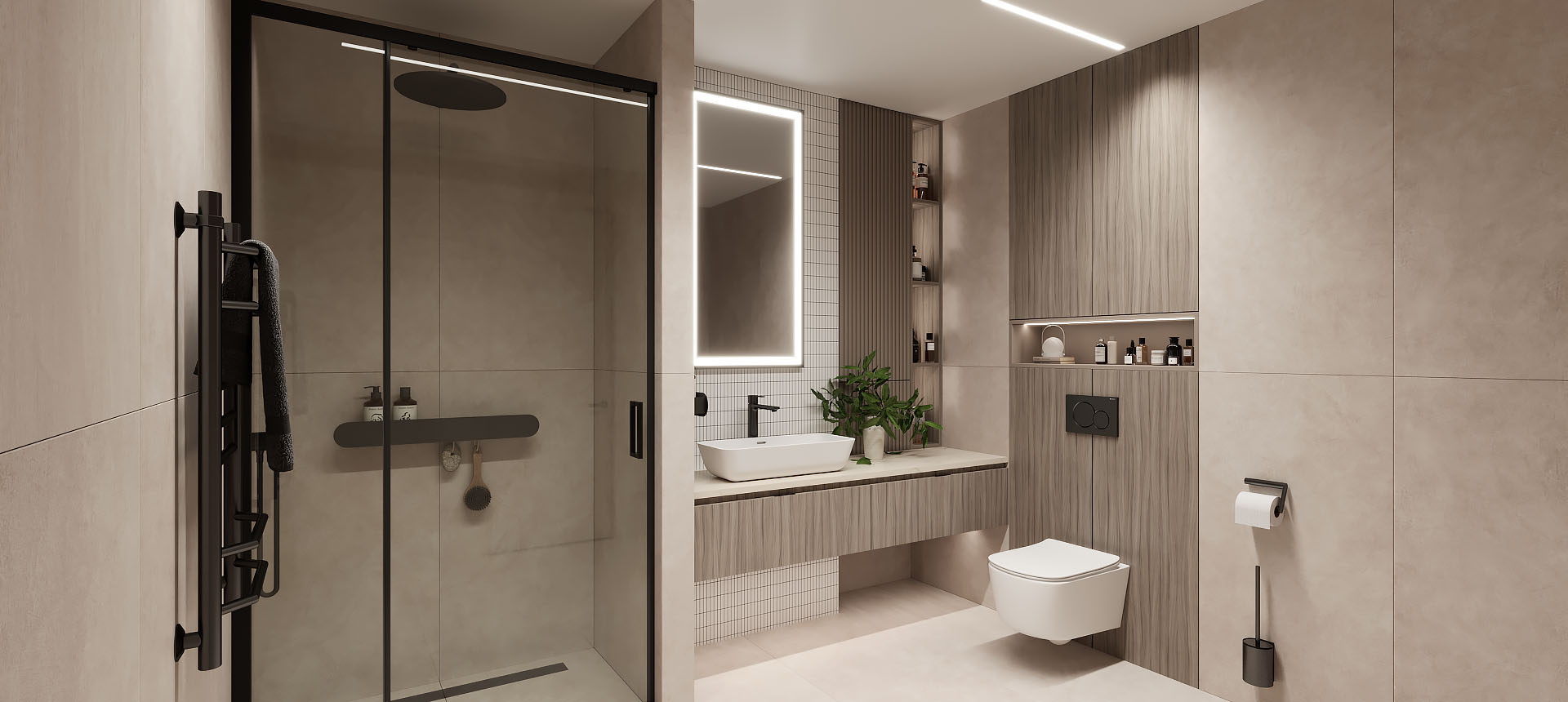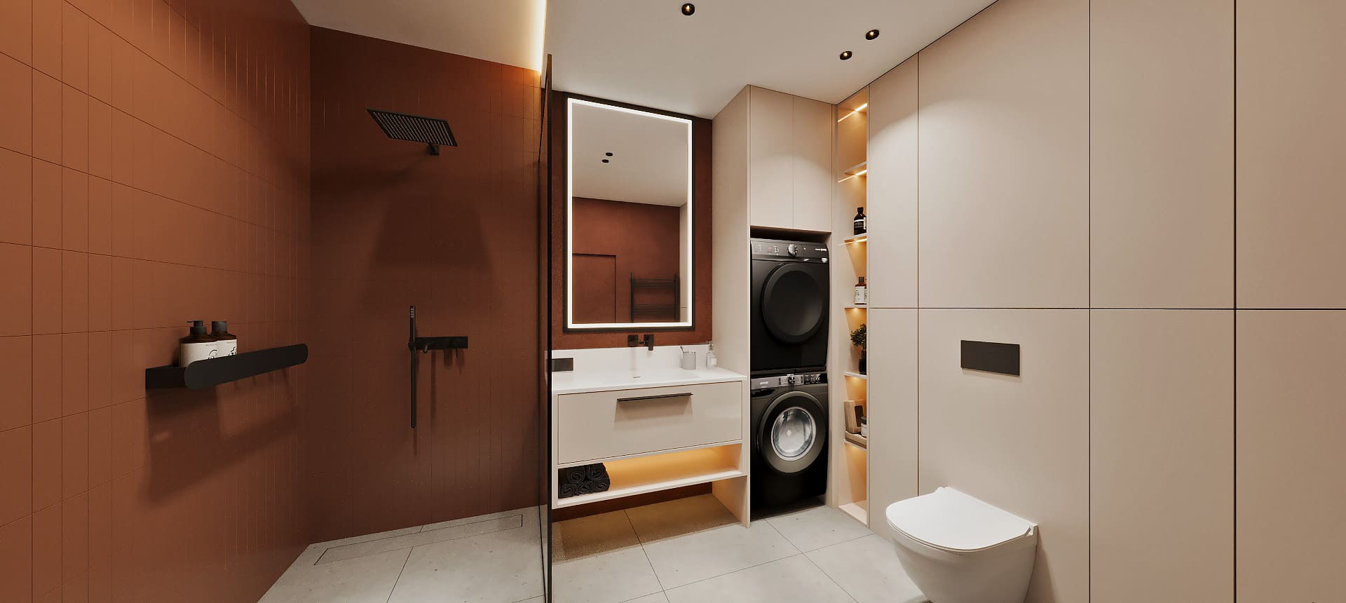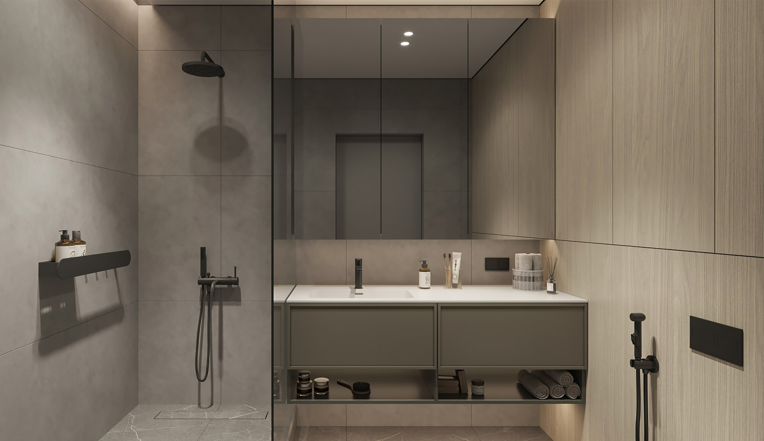 «У меня все проекты с компанией («Стильные Кухни и Интерьеры) были хорошие, но мебелью в ванную комнату я довольна больше всего на свете. Мне сделали тумбу под раковину, две навесные колонки по бокам, зеркало с подсветкой, а также встроенный шкаф напротив. Из-за высоты потолков и размеров шкафов было непросто спроектировать все так, как надо: были опасения, что дверцы ослабнут, что тяжелые дверцы нельзя будет открывать одним легким нажатием. Но в итоге в фасады добавили направляющие, которые их усиливают. И еще удалось сделать эти высокие двери с механизмом push-to-open. У меня не очень большая площадь ванной, поэтому хотелось обойтись без лишних деталей, в том числе и выступающих ручек, которые я бы постоянно задевала»,