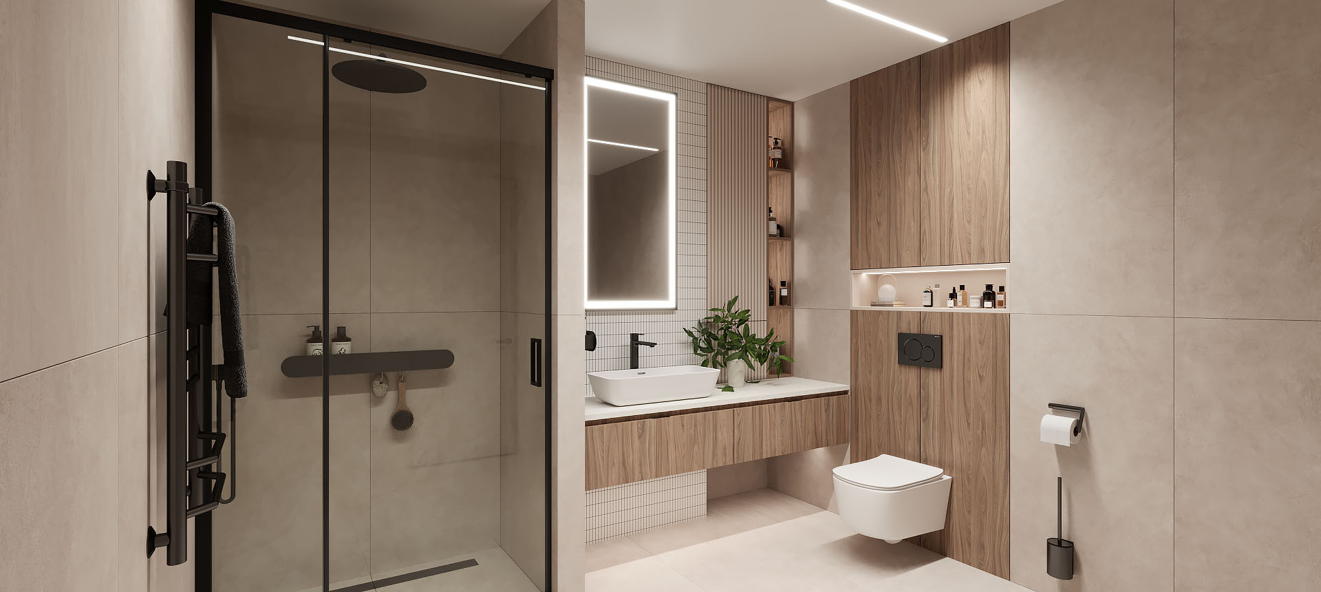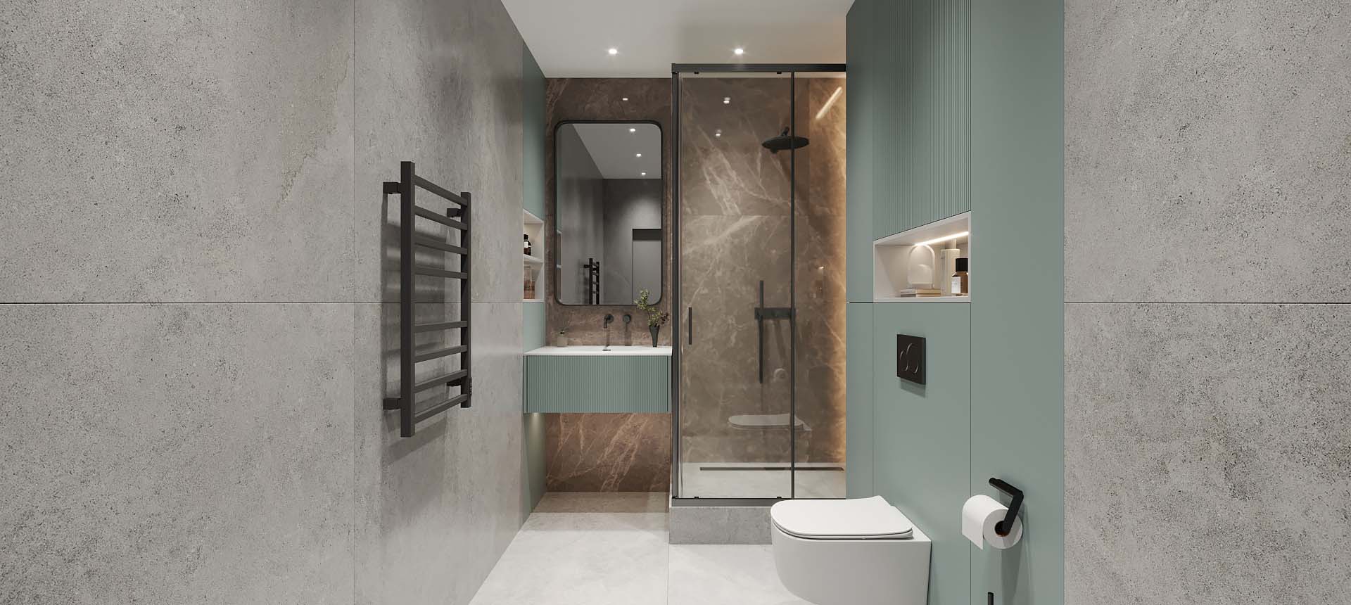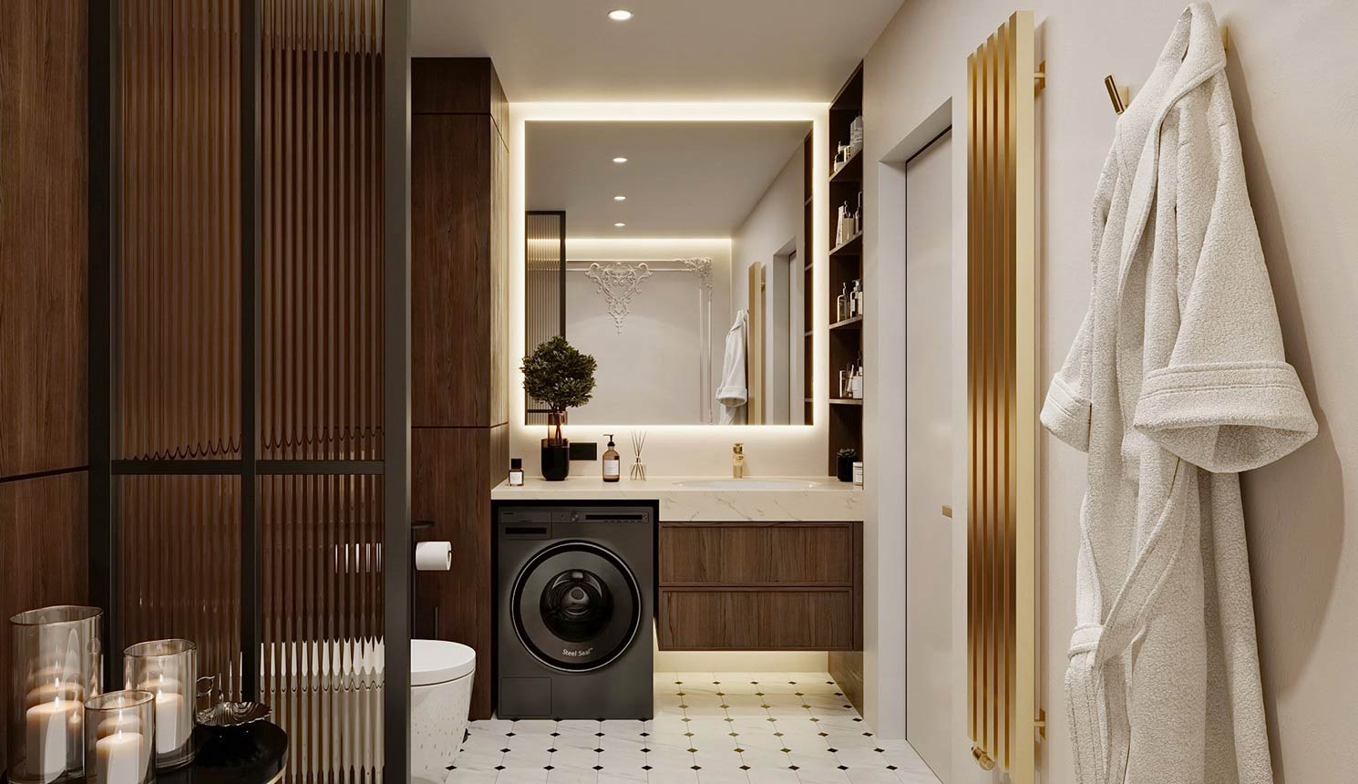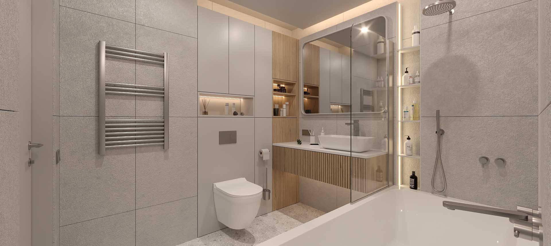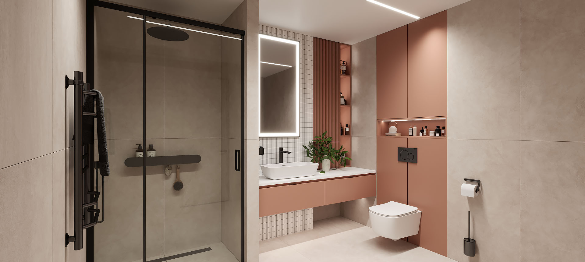 «У меня все проекты с компанией («Стильные Кухни и Интерьеры) были хорошие, но мебелью в ванную комнату я довольна больше всего на свете. Мне сделали тумбу под раковину, две навесные колонки по бокам, зеркало с подсветкой, а также встроенный шкаф напротив. Из-за высоты потолков и размеров шкафов было непросто спроектировать все так, как надо: были опасения, что дверцы ослабнут, что тяжелые дверцы нельзя будет открывать одним легким нажатием. Но в итоге в фасады добавили направляющие, которые их усиливают. И еще удалось сделать эти высокие двери с механизмом push-to-open. У меня не очень большая площадь ванной, поэтому хотелось обойтись без лишних деталей, в том числе и выступающих ручек, которые я бы постоянно задевала»,