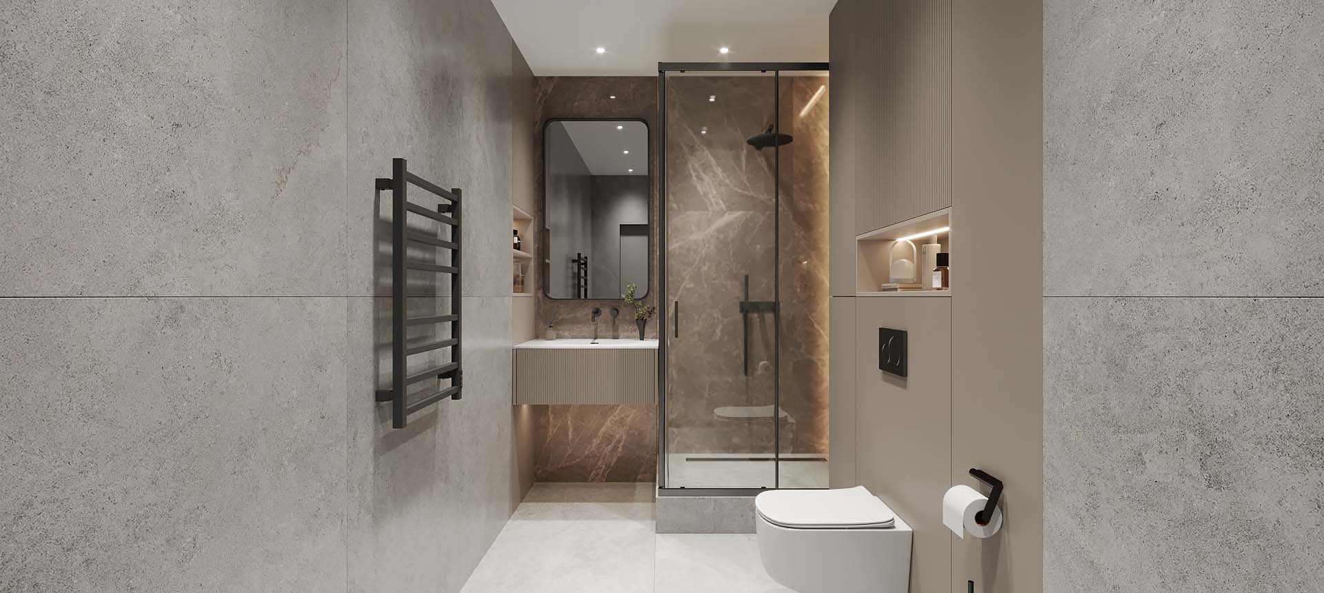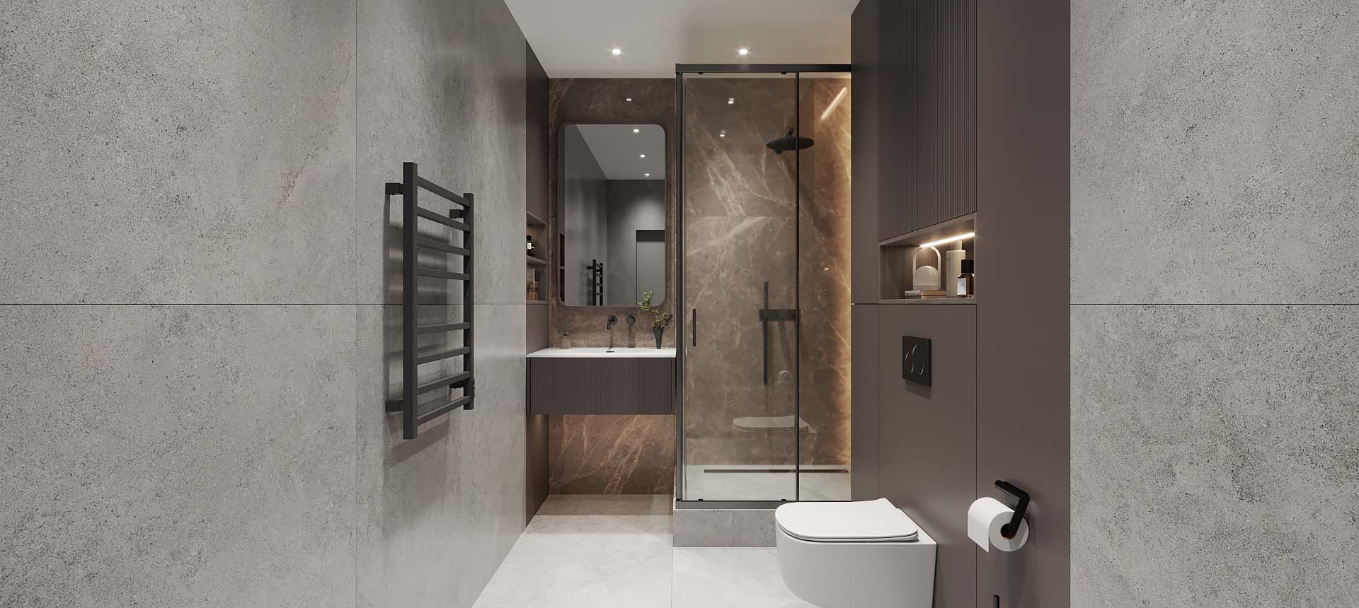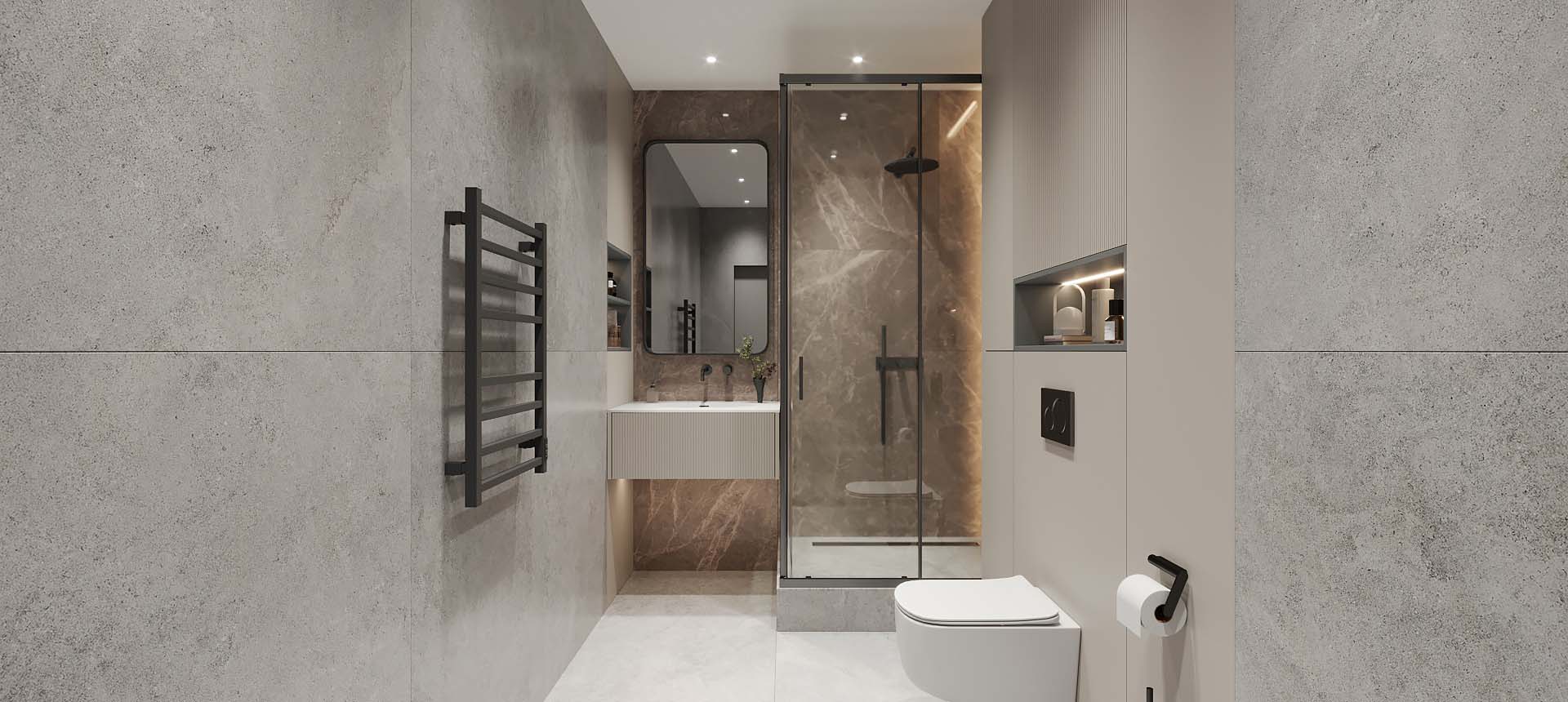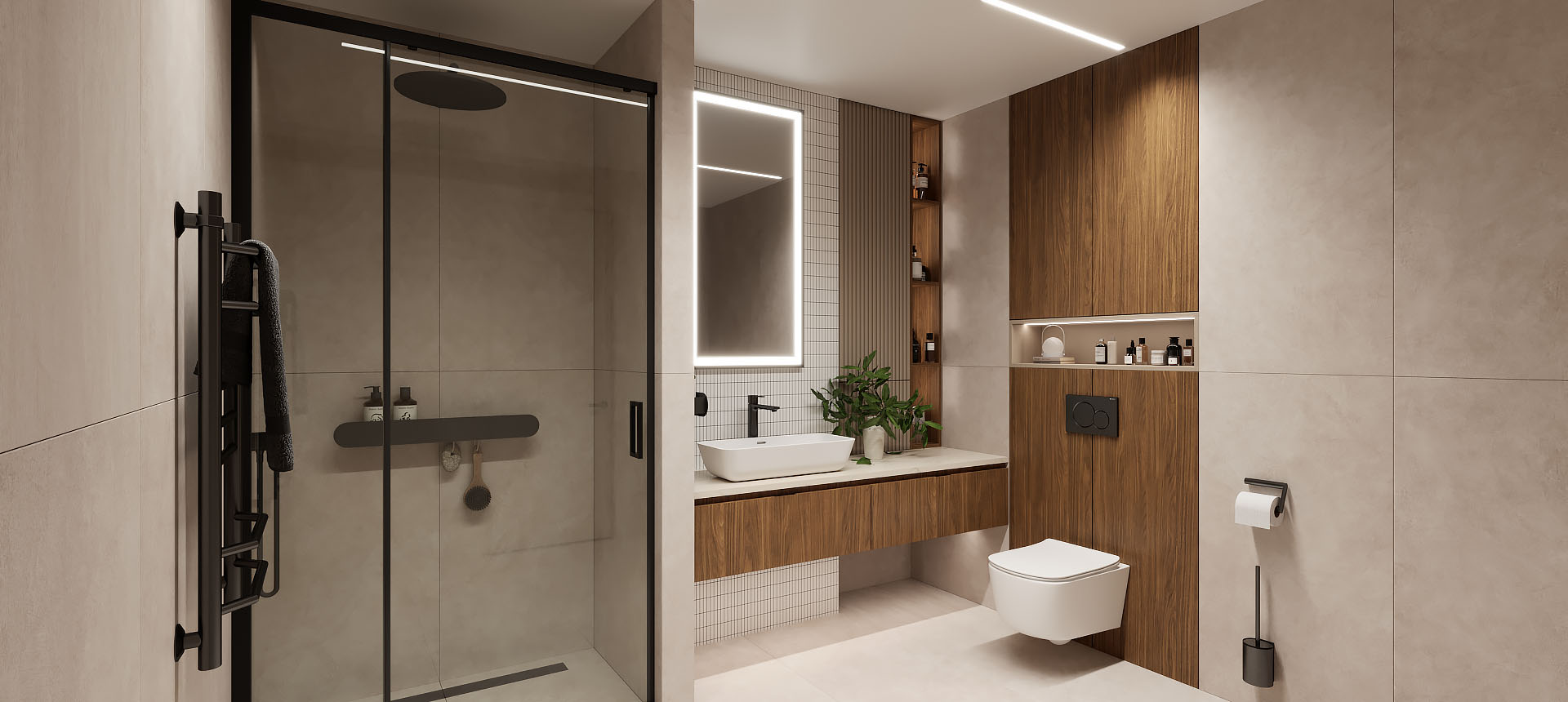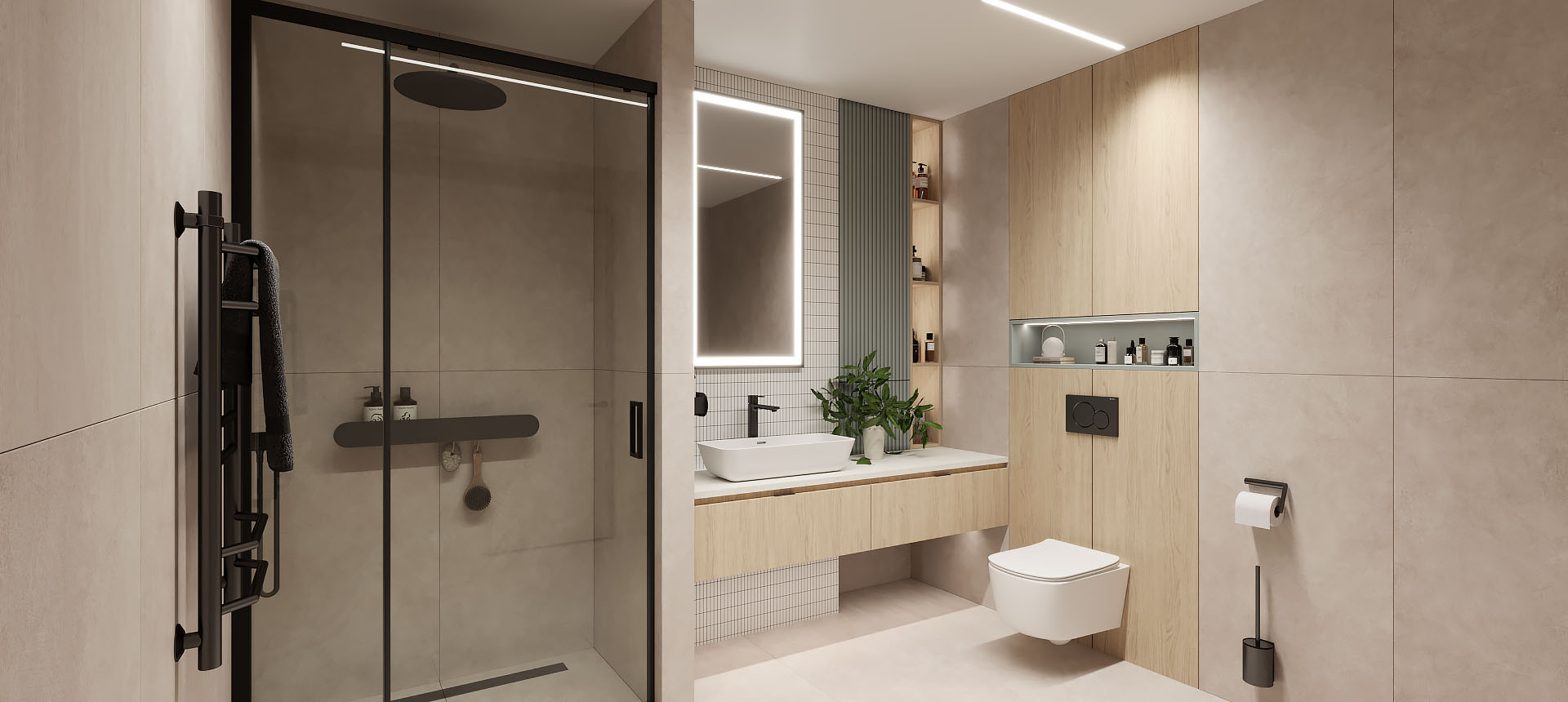 «У меня все проекты с компанией («Стильные Кухни и Интерьеры) были хорошие, но мебелью в ванную комнату я довольна больше всего на свете. Мне сделали тумбу под раковину, две навесные колонки по бокам, зеркало с подсветкой, а также встроенный шкаф напротив. Из-за высоты потолков и размеров шкафов было непросто спроектировать все так, как надо: были опасения, что дверцы ослабнут, что тяжелые дверцы нельзя будет открывать одним легким нажатием. Но в итоге в фасады добавили направляющие, которые их усиливают. И еще удалось сделать эти высокие двери с механизмом push-to-open. У меня не очень большая площадь ванной, поэтому хотелось обойтись без лишних деталей, в том числе и выступающих ручек, которые я бы постоянно задевала»,
