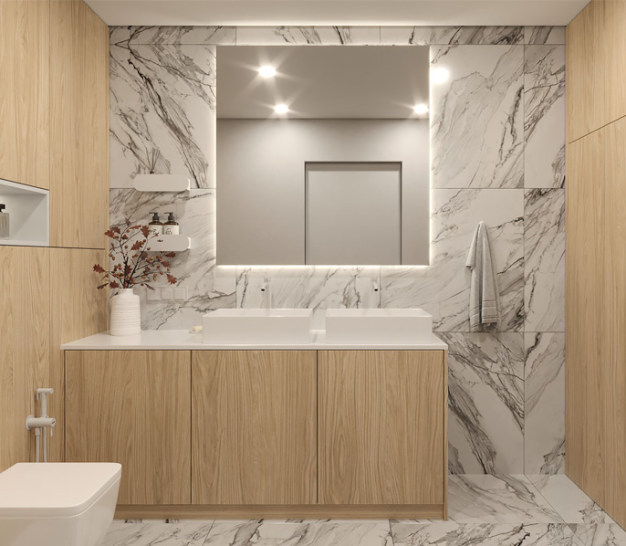 «В попытках сэкономить я хотела сделать мебель для ванной комнаты на заказ, а раковину купить готовую: мне казалось, так получится дешевле. Я даже купила раковину в гипермаркете, правда, расходные материалы к ней надо было покупать отдельно. А в компании «Стильные Кухни и Интерьеры» как раз началась акция на раковины из искусственного камня, которые уже были укомплектованы внутренним клапаном, сифоном, бесплатной установкой и подключением. В итоге, купленную в магазине раковину, мы сдали обратно, не распаковывая, и заказали к нашей тумбе столешницу с интегрированной мойкой из искусственного камня»,