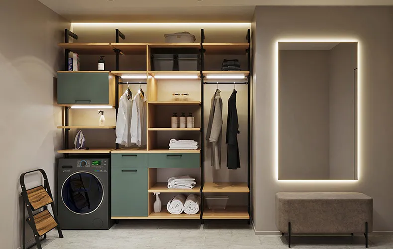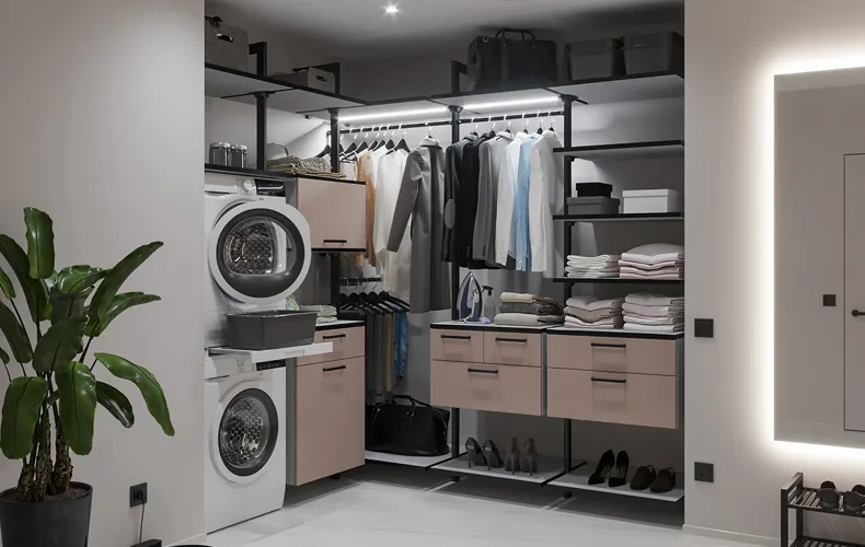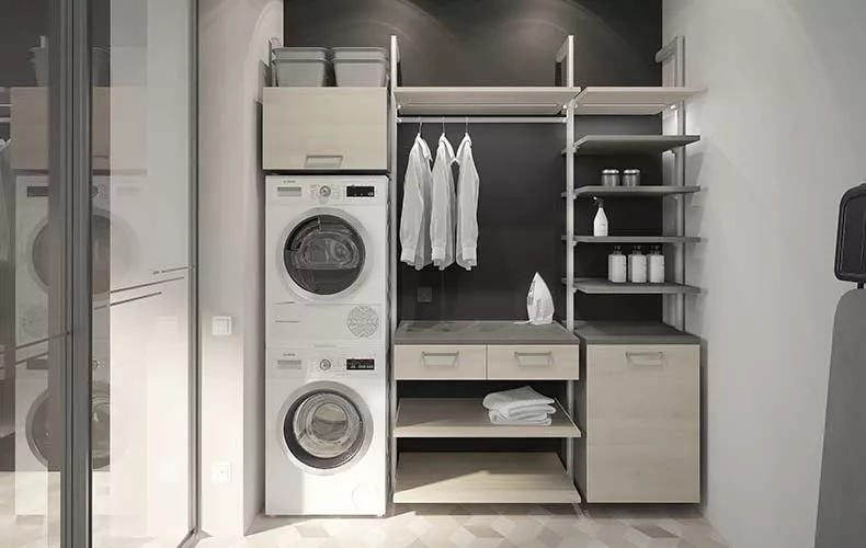 Комплект мебели предназначен для обустройства прачечной комнаты в частном доме или в социальном учреждении. Набор представляет собой систему с закрытыми полками, выдвижными ящиками, нишами под стиральную и сушильную машины. Также предусмотрены столешница с раковиной и смесителем, гладильная доска. Шкафы для прачечной изготовлены из прочной и устойчивой к влаге ЛДСП Egger, внешняя отделка – матовое фасадное полотно. Внутри ящиков установлены ёмкости для хранения хозяйственных принадлежностей.