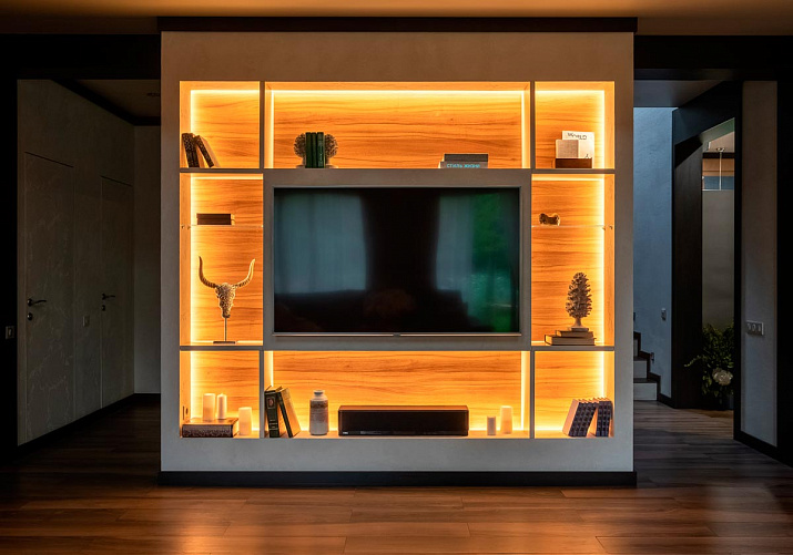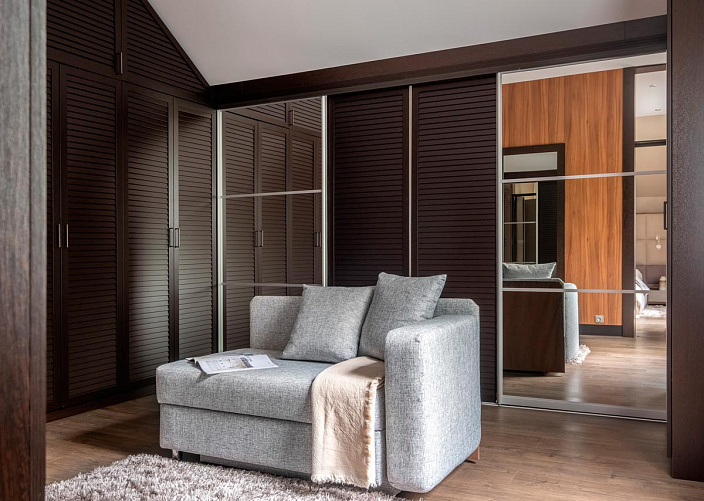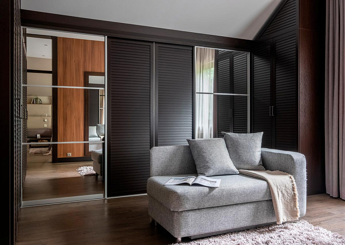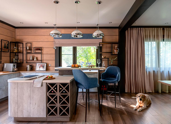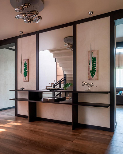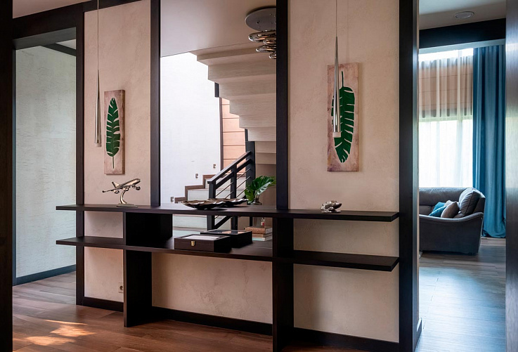 Первый этаж — воплощение идеального сценария, образа жизни заказчиков: в эргономичном и презентабельном холле удобно встречать гостей, уютная кухня-столовая располагает к кулинарному творчеству и непринужденным беседам, а в просторной гостиной предусмотрено все для отдыха за просмотром кино или игры в бильярд. Идея проекта заключалась в разделении пространства на зоны, плавно перетекающих друг в друга, объединяя при этом всех, кто находится в доме.