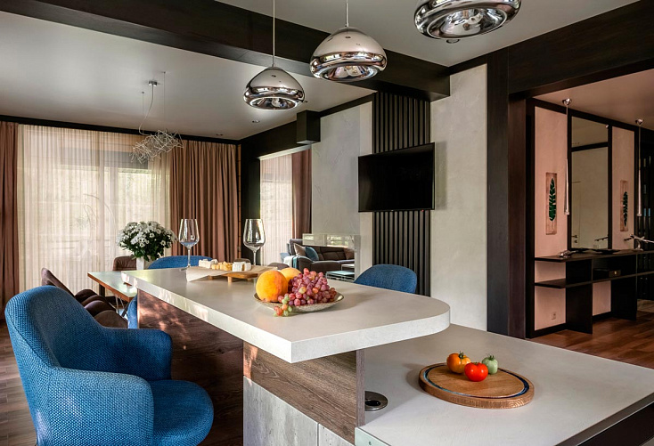 • Красивая кухня с золотыми акцентами в двухкомнатной квартире бизнес-класса