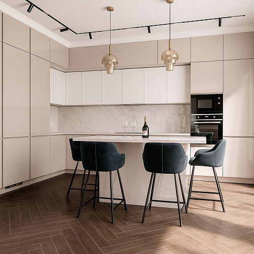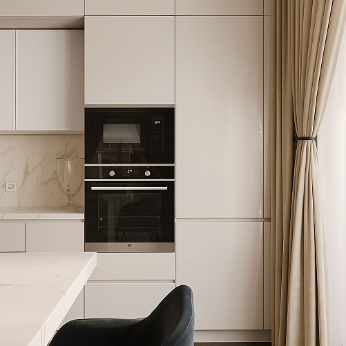 Эта кухня — настоящий оазис света и уюта! Светлые тона создают атмосферу свежести и гармонии, а просторный остров с мраморной столешницей приглашает собираться всей семьей за завтраком или вечерними разговорами. Большие окна наполняют пространство солнечным светом, а мягкие шторы добавляют тепла и уюта. Здесь каждый элемент продуман до мелочей, чтобы создавать комфорт и вдохновлять на кулинарные подвиги. Эта кухня — идеальное место для радостных встреч и приятного времяпрепровождения!