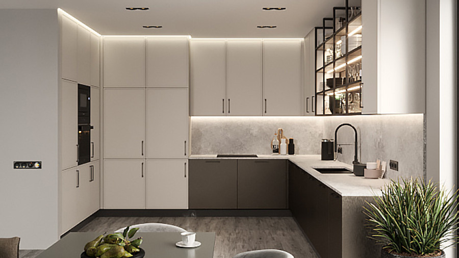 Кухонный гарнитур Ренцо 6 имеет п-образную конфигурацию с колонками и элементами из металла. По левую сторону расположены встроенные шкафы-колонки под бытовую технику, холодильник и хранение. В центральной части кухни и в правой секции располагается рабочая зона со столешницей из агломерата. Эффектно смотрятся открытые полки из алюминиевого профиля с подсветкой. Нижние шкафы представлены фасадами «Маттео Лайт», бежевые фасады «Ренцо» в эмали.