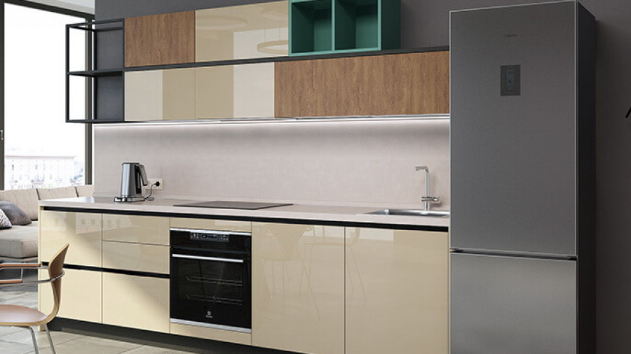 Гарнитур Лучидо, выполненный в минималистичном дизайне, будет эффектно смотреться на кухне в современной стилистике. Прямая конструкция позволит разместить мебель вдоль стены, что очень удобно в условиях ограниченного пространства. В оформлении использованы оригинальные сочетания фактур и оттенков: кремовые фасады из глянцевой плиты, навесные шкафы с древесным декором Фабио, металлические элементы, полки из ЛДСП Egger в ярко-зелёном цвете. Глянцевые поверхности Acrylux облицованы акриловым пластиком, устойчивым к повреждениям и выцветанию. Кухонный гарнитур оснащён встроенной техникой и подсветкой.