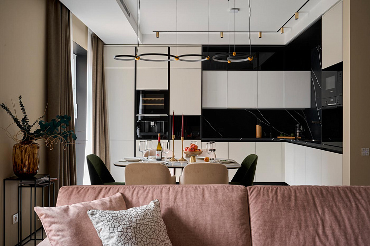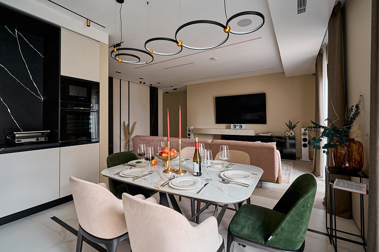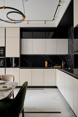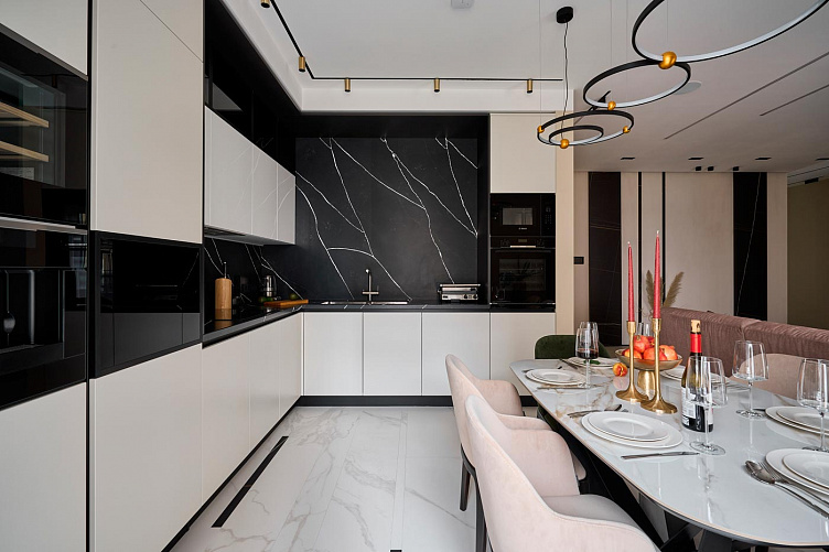 Кухонный гарнитур Лучидо идеально дополнит интерьер в современной стилистике. Угловая конструкция будет одинаково уместной и в маленьких помещениях, и в просторных кухнях, совмещённых с гостиной. Для оформления фасадов используются глянцевые белые и матовые чёрные плиты. Благодаря встроенной подсветке, отражающим свет поверхностям и сочетанию контрастных цветов создаётся эффект глубины. Гарнитур оснащён различными системами хранения, навесными и напольными шкафами, бытовой техникой. Также предусмотрен холодильник и кухонный телевизор. В качестве завершающей детали – обеденный стол на одной опоре.